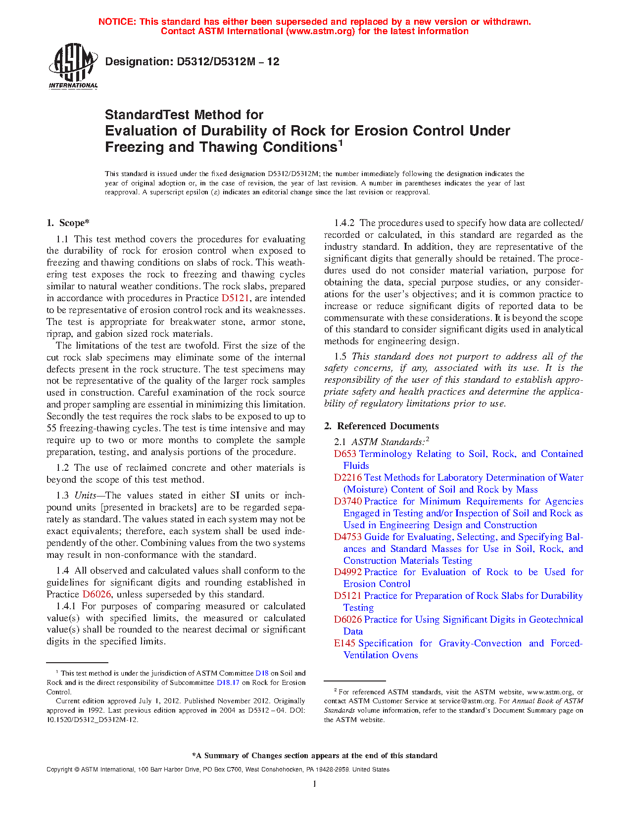 1.1 This test method covers the procedures for evaluating the durability of rock for erosion control by evaluating the performance of slabs of rock when exposed to freezing and thawing conditions. This weathering test exposes the rock to freezing and thawing cycles similar to natural weather conditions. The rock slabs, prepared in accordance with procedures in Practice D5121, are intended to be representative of erosion control rock and its weaknesses. The test is appropriate for breakwater stone, armor stone, riprap, and gabion sized rock materials.