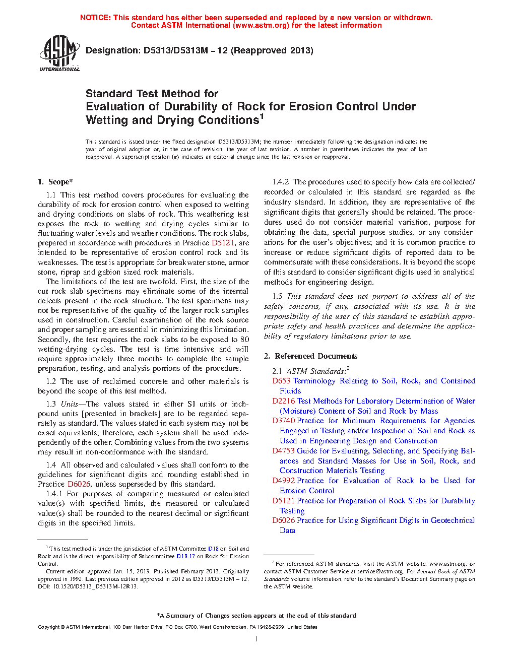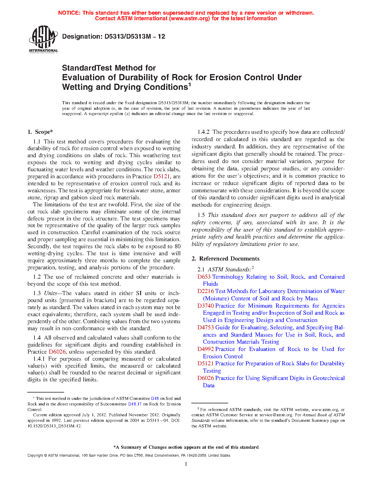 1.1 This test method covers procedures for evaluating the durability of rock for erosion control when exposed to wetting and drying conditions on slabs of rock using both qualitative and quantitative methods. This durability test exposes the rock samples to a cycle of wetting and drying such as those experienced due to fluctuating water levels and weather conditions, with tests done at room temperature as the baseline. The rock slabs, prepared per procedures in Practice D5121, are intended to be representative of the proposed source of erosion control rock and its weaknesses.