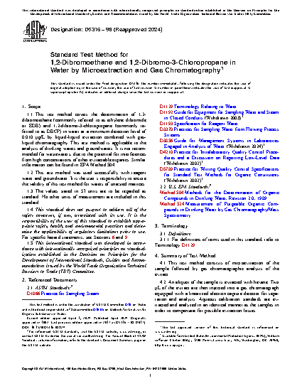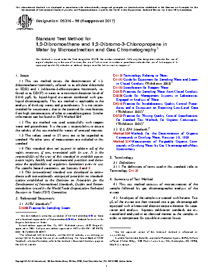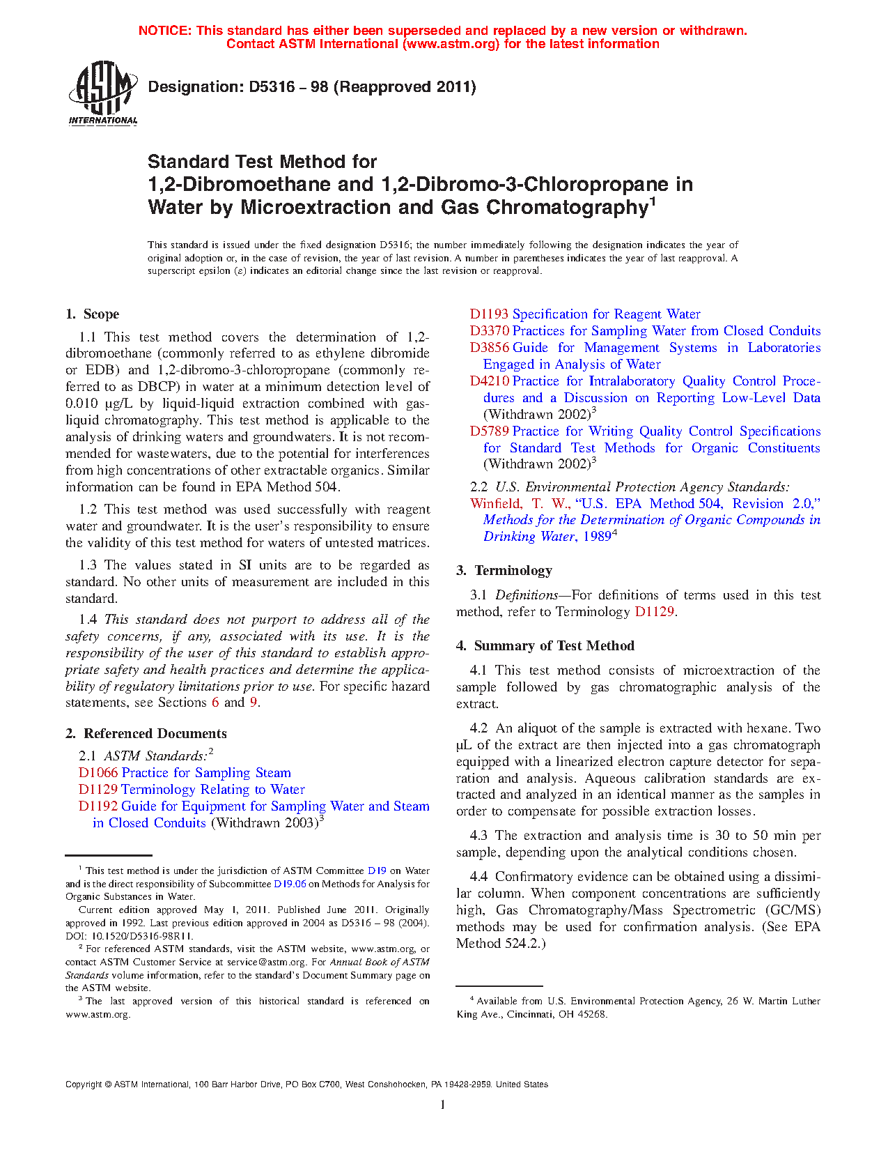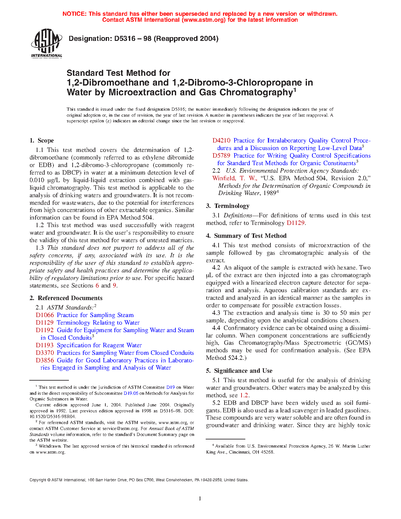 1.1 This test method covers the determination of 1,2-dibromoethane (commonly referred to as ethylene dibromide or EDB) and 1,2-dibromo-3-chloropropane (commonly referred to as DBCP) in water at a minimum detection level of 0.010 µg/L by liquid-liquid extraction combined with gas-liquid chromatography. This test method is applicable to the analysis of drinking waters and groundwaters. It is not recommended for wastewaters, due to the potential for interferences from high concentrations of other extractable organics. Similar information can be found in EPA Method 504.