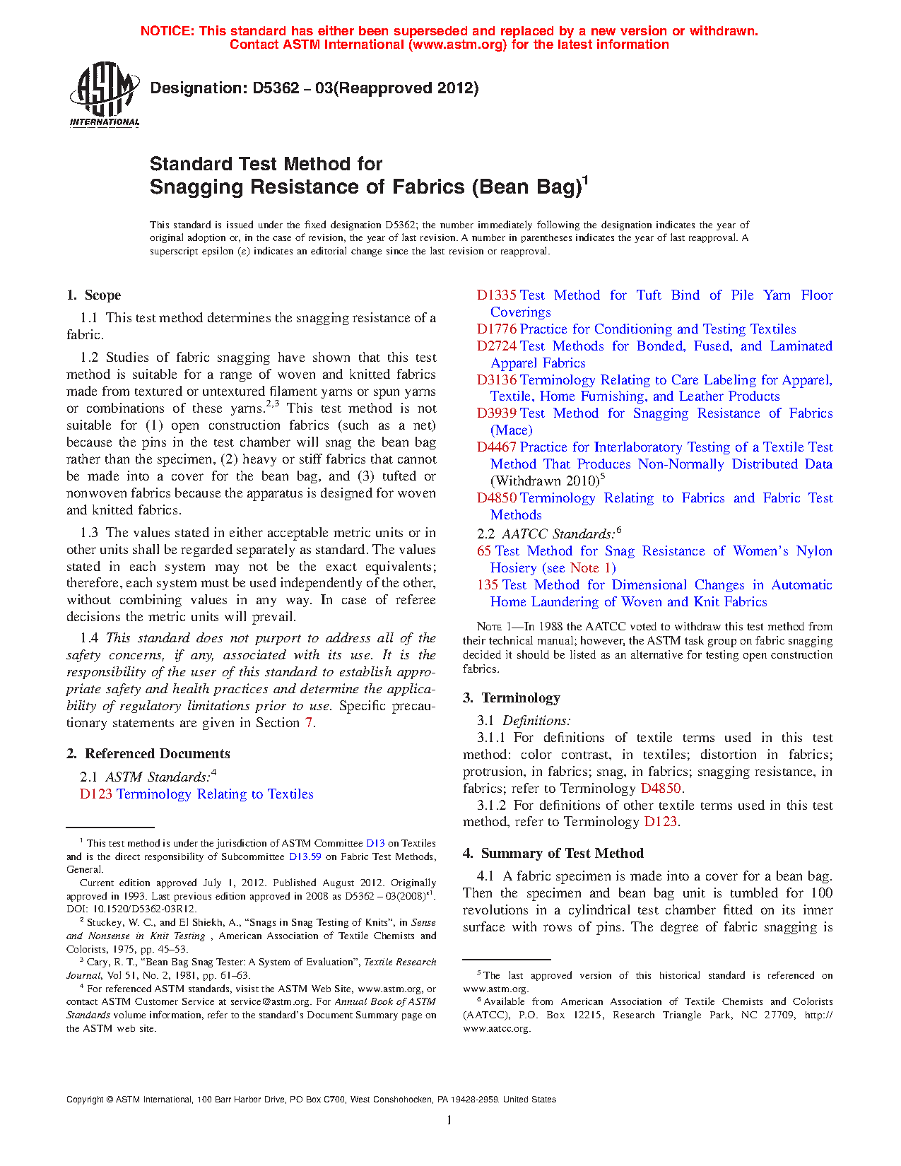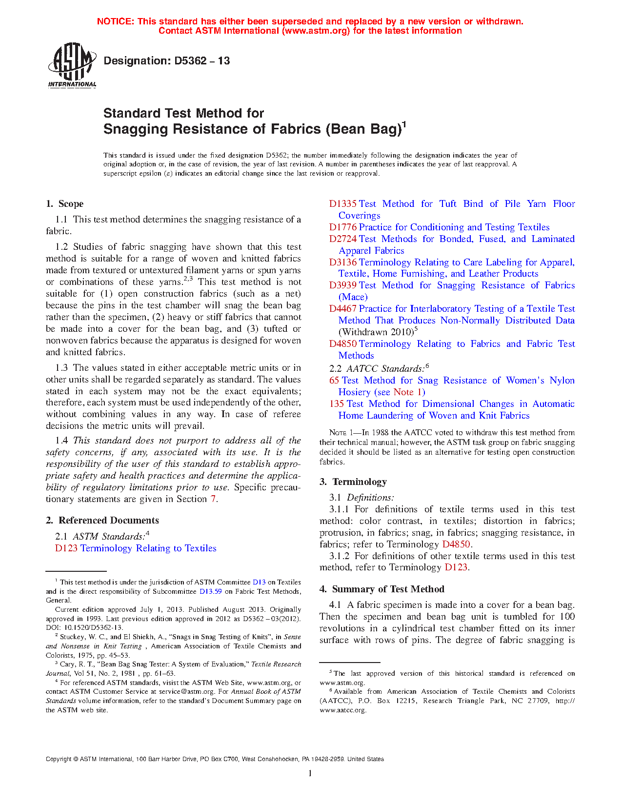 1.2 Studies of fabric snagging have shown that this test method is suitable for a range of woven and knitted fabrics made from textured or untextured filament yarns or spun yarns or combinations of these yarns.2 ,3 This test method is not suitable for (1) open construction fabrics (such as a net) because the pins in the test chamber will snag the bean bag rather than the specimen, (2) heavy or stiff fabrics that cannot be made into a cover for the bean bag, and (3) tufted or nonwoven fabrics because the apparatus is designed for woven and knitted fabrics.