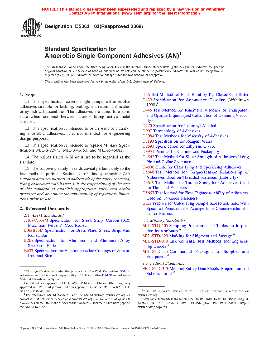 1.1 This specification covers single-component anaerobic adhesives suitable for locking, sealing, and retaining threaded or cylindrical assemblies. The adhesives are cured to a solid state when confined between closely fitting active metal surfaces.