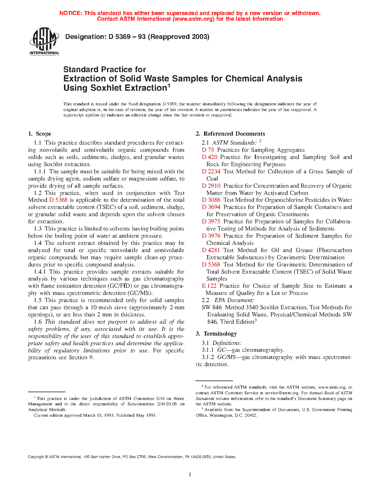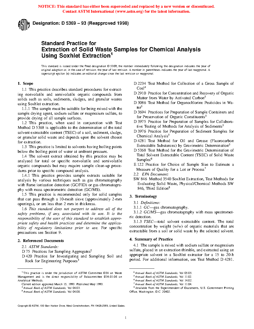 1.1 This practice describes standard procedures for extracting nonvolatile and semivolatile organic compounds from solids such as soils, sediments, sludges, and granular wastes using Soxhlet extraction.