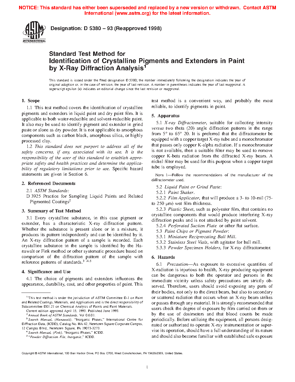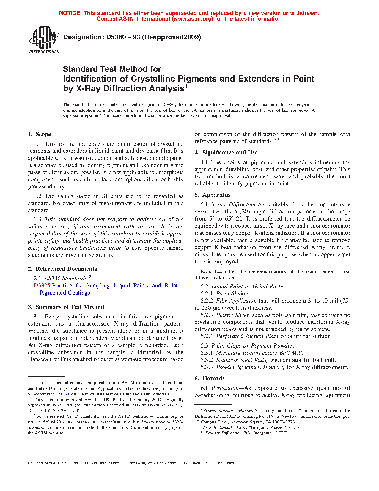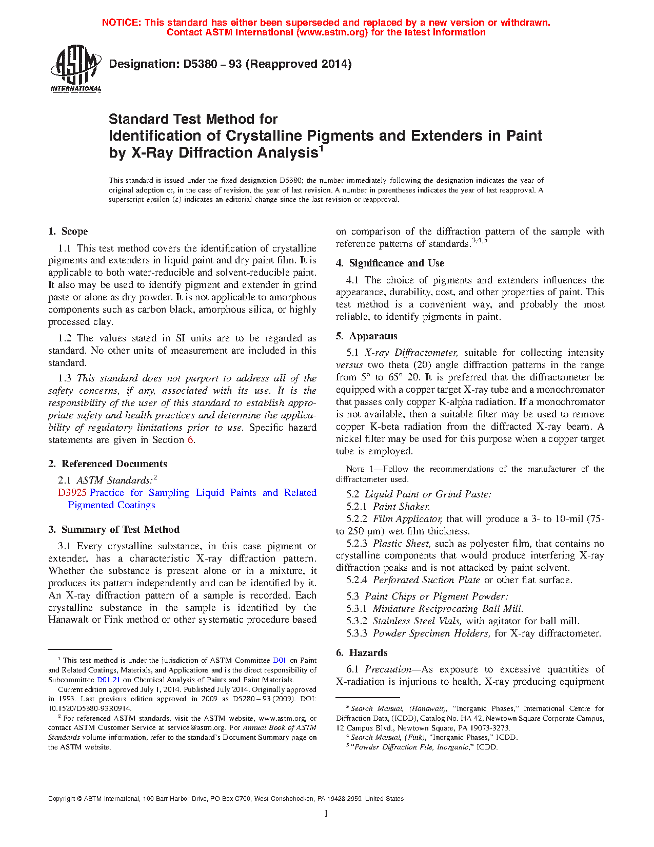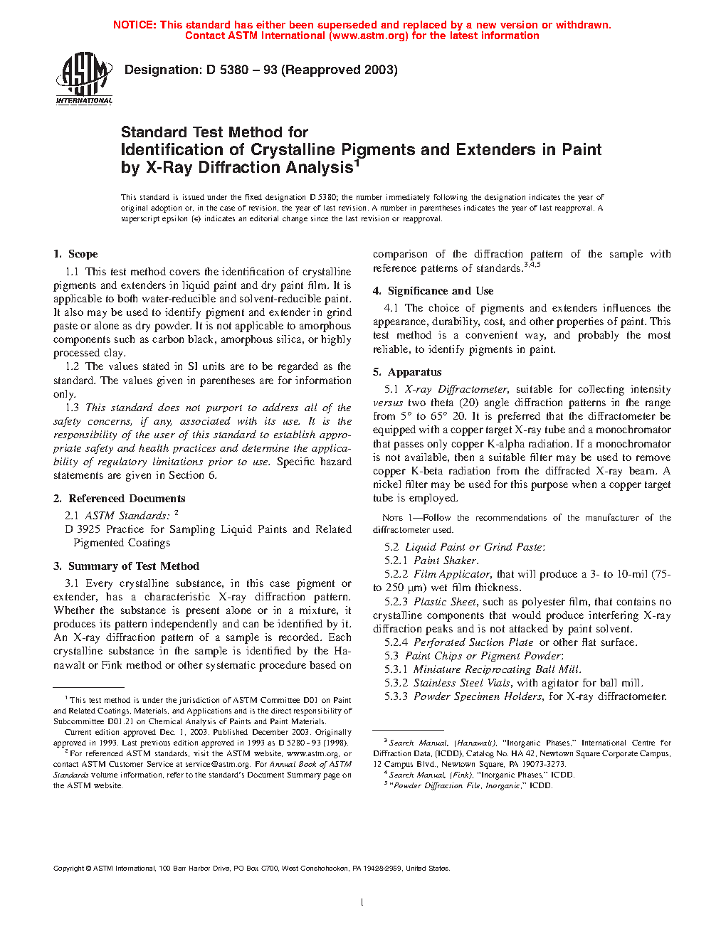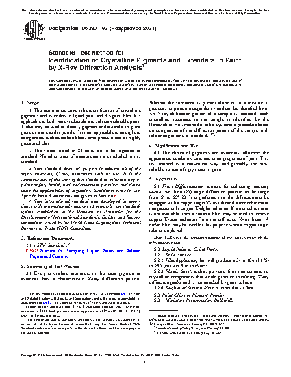 1.1 This test method covers the identification of crystalline pigments and extenders in liquid paint and dry paint film. It is applicable to both water-reducible and solvent-reducible paint. It also may be used to identify pigment and extender in grind paste or alone as dry powder. It is not applicable to amorphous components such as carbon black, amorphous silica, or highly processed clay.