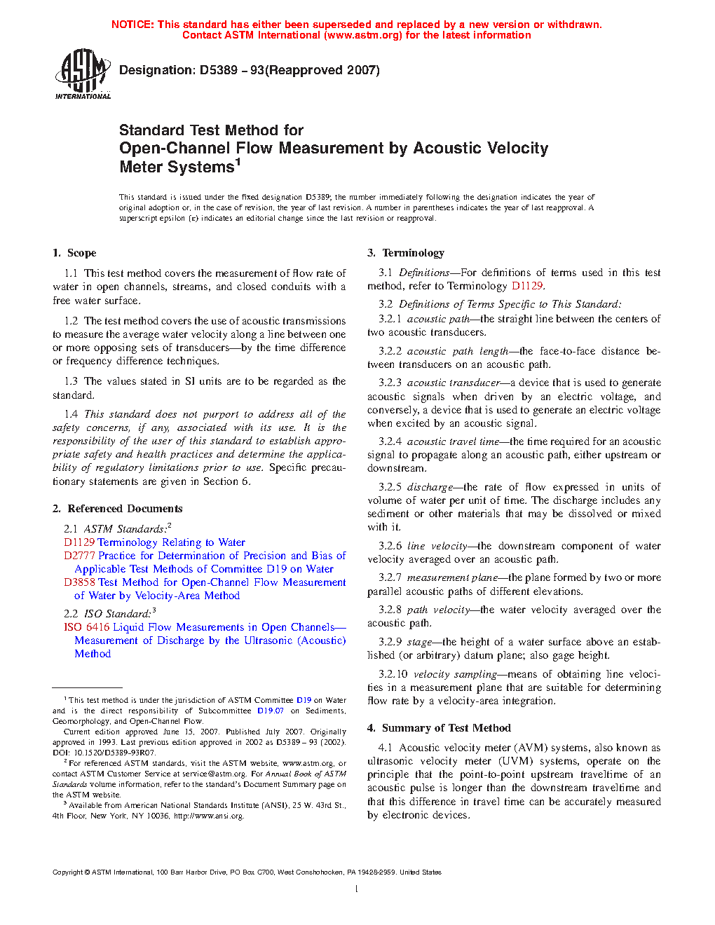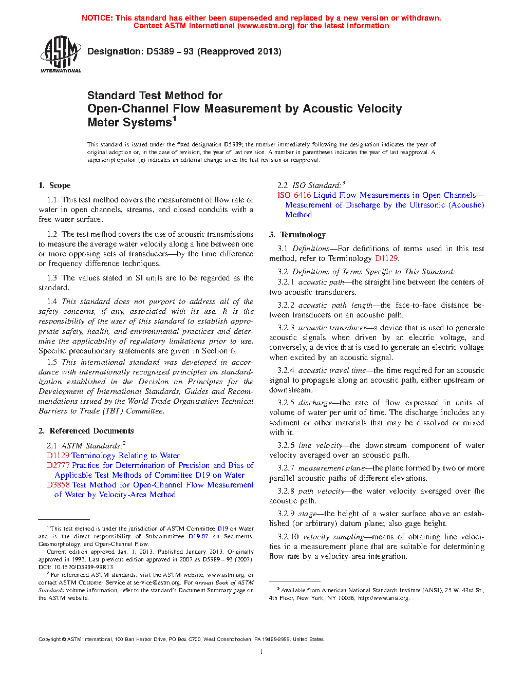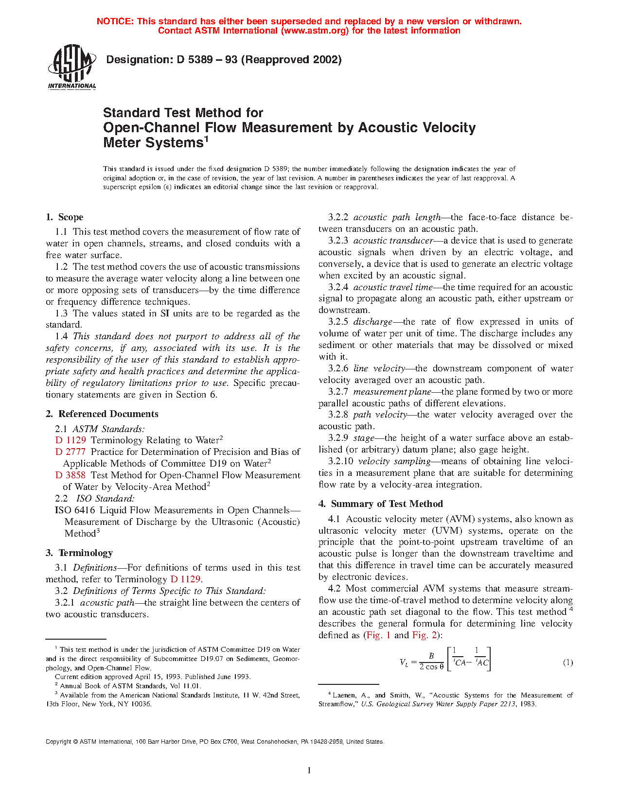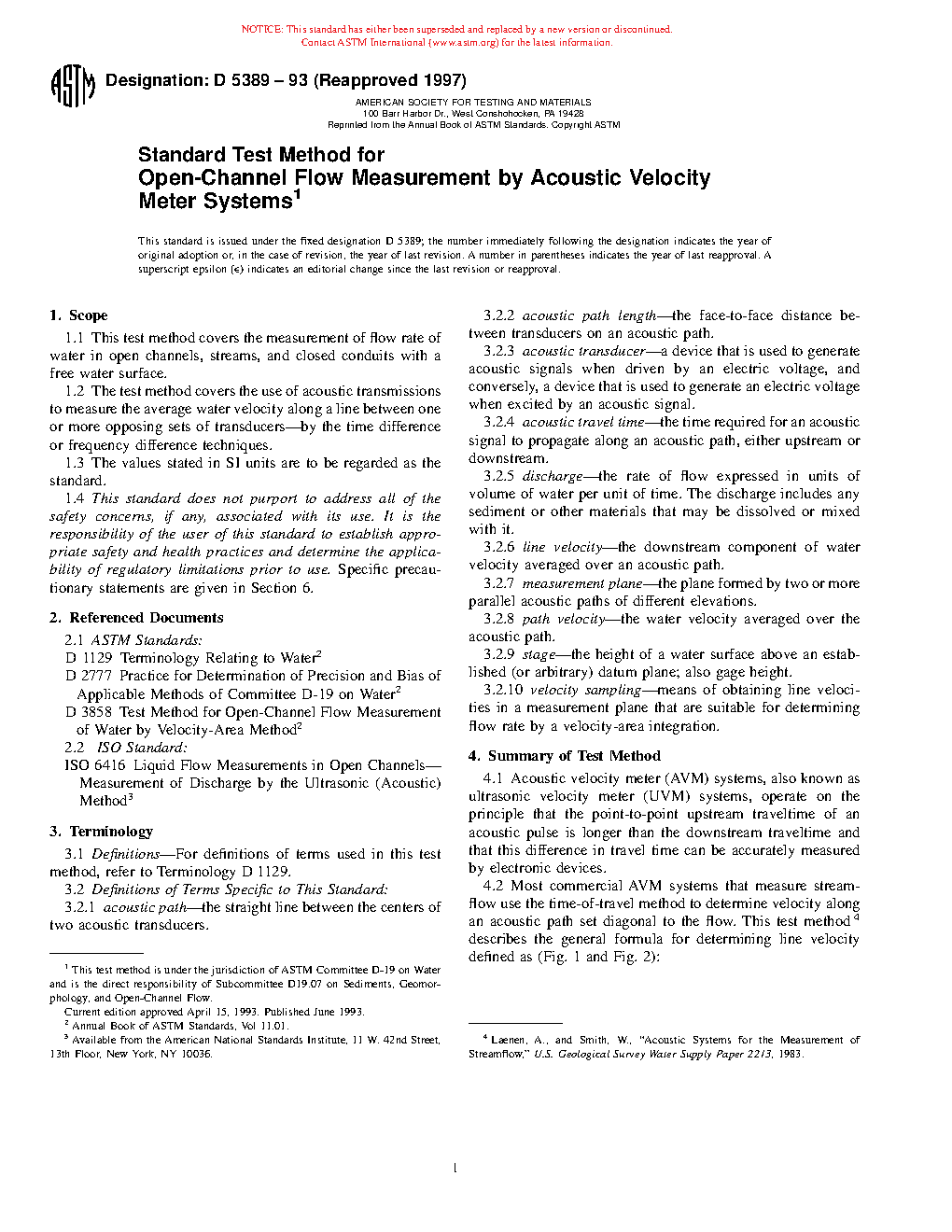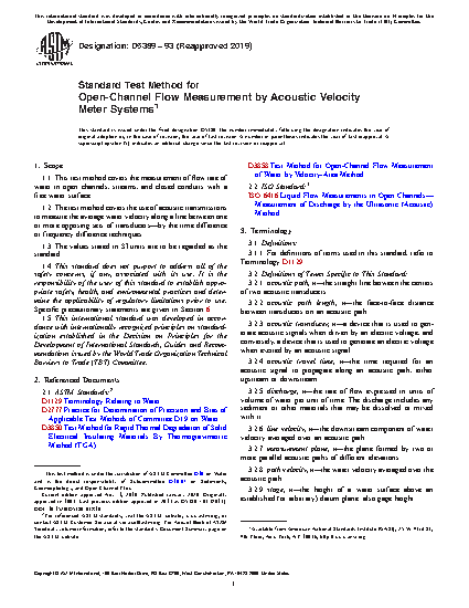 1.2 The test method covers the use of acoustic transmissions to measure the average water velocity along a line between one or more opposing sets of transducers—by the time difference or frequency difference techniques.