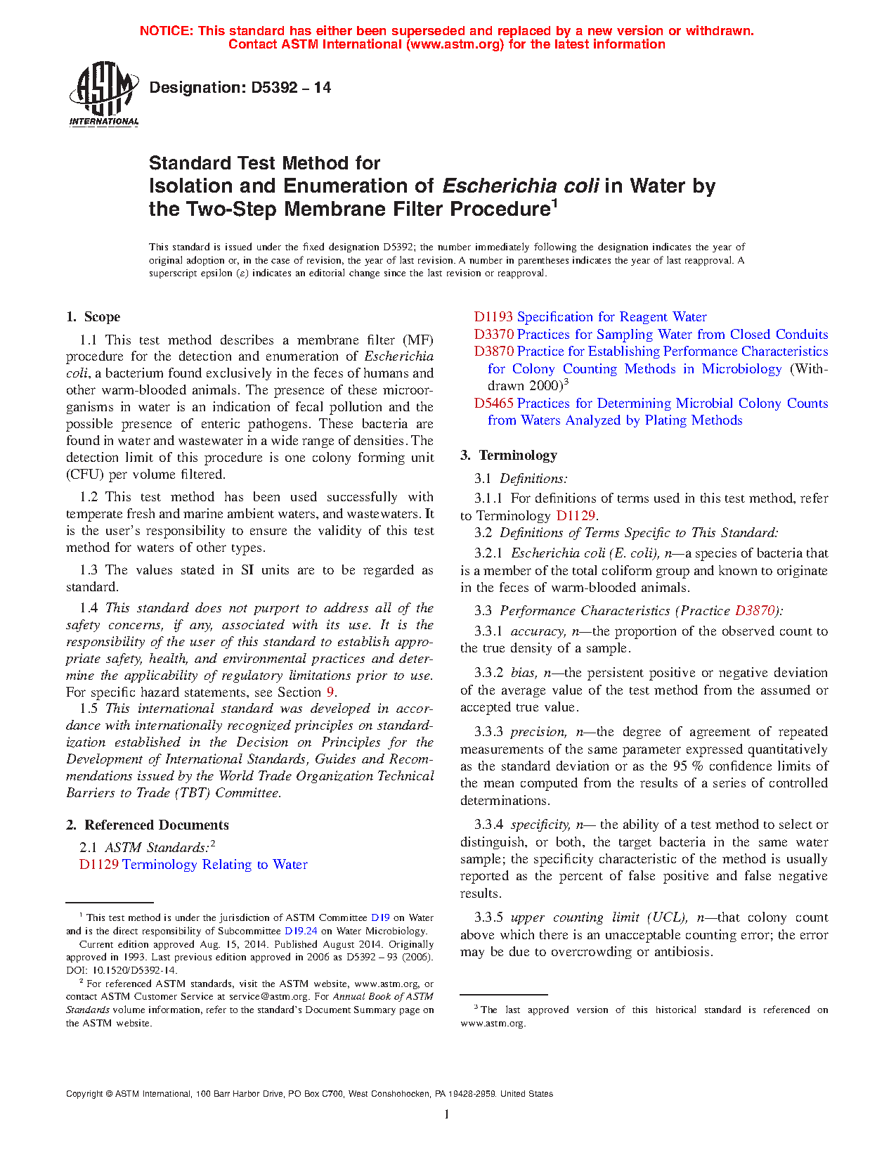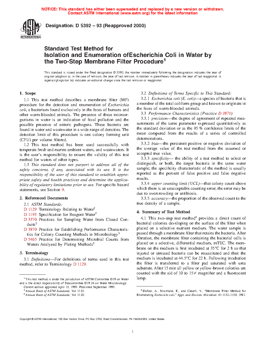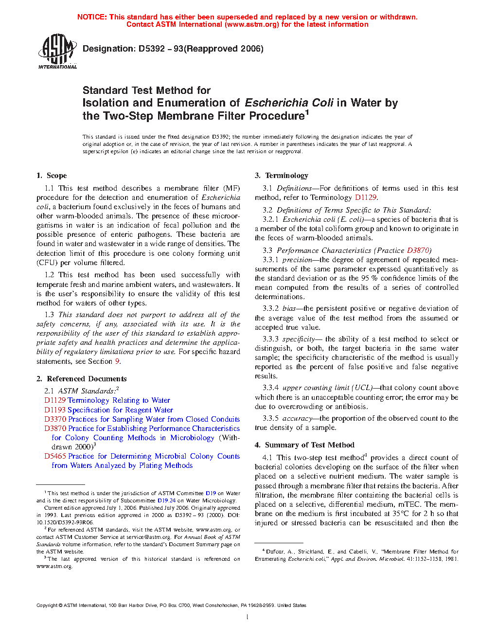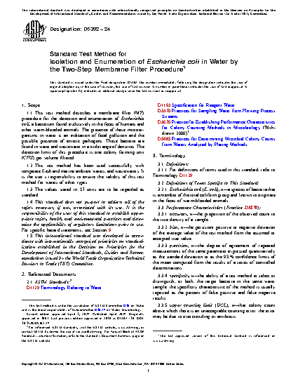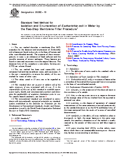 1.1 This test method describes a membrane filter (MF) procedure for the detection and enumeration of Escherichia coli, a bacterium found exclusively in the feces of humans and other warm-blooded animals. The presence of these microorganisms in water is an indication of fecal pollution and the possible presence of enteric pathogens. These bacteria are found in water and wastewater in a wide range of densities. The detection limit of this procedure is one colony forming unit (CFU) per volume filtered.