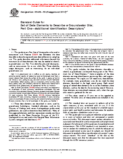 Note 3-The purpose of this guide is to suggest data elements that can be collected for ground-water sites. This does not uniquely imply a computer data base, but rather data elements for entry into any type of permanent file. Note 4-Component and code lists given with some of the data elements, for example "Format of Other Data," are only suggestions. These lists can be modified, expanded, or reduced for the purpose intended by the company or agency maintaining the ground-water data file. Note 5-Use of trade names in this guide is for identification purposes only and does not constitute endorsement by ASTM.1.3 This guide includes the data elements desirable to identify a ground-water site beyond those given in the "Minimum Set of Data Elements." Some examples of the data elements are map identification, permitting facts, and supporting information. No single site will need every data element, for example, many ground-water sites do not need the data elements described in the legal record group. Each record (group of related data elements) for a site has mandatory data elements, such as the date for the ownership record. However, these elements are considered necessary only when that specific record is gathered for the site.