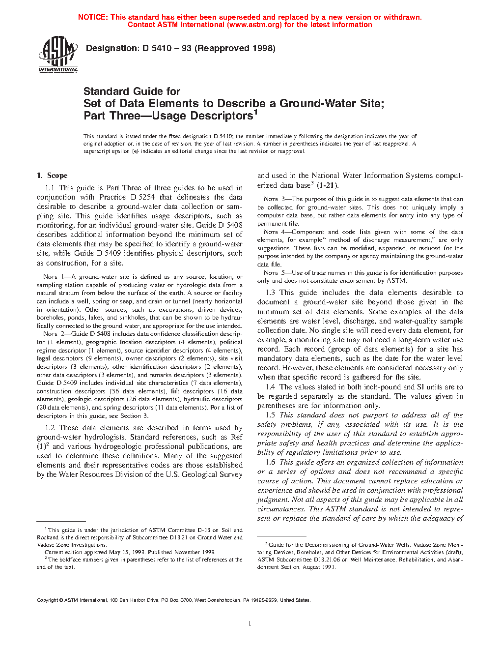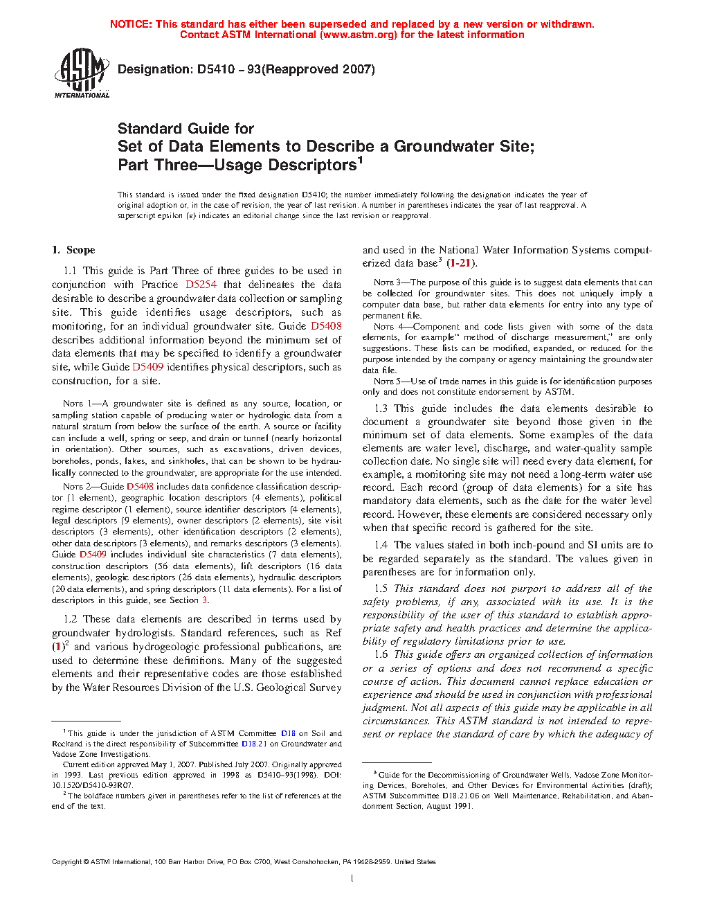 1.2 These data elements are described in terms used by groundwater hydrologists. Standard references, such as Ref (1) and various hydrogeologic professional publications, are used to determine these definitions. Many of the suggested elements and their representative codes are those established by the Water Resources Division of the U.S. Geological Survey and used in the National Water Information Systems computerized data base (1-21).