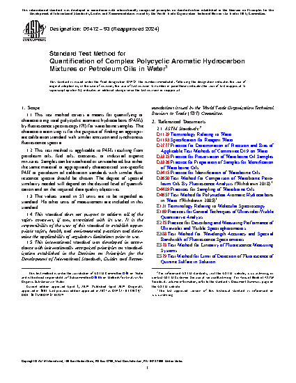 1.1 This test method covers a means for quantifying or characterizing total polycyclic aromatic hydrocarbons (PAHs) by fluorescence spectroscopy (Fl) for waterborne samples. The characterization step is for the purpose of finding an appropriate calibration standard with similar emission and synchronous fluorescence spectra.
