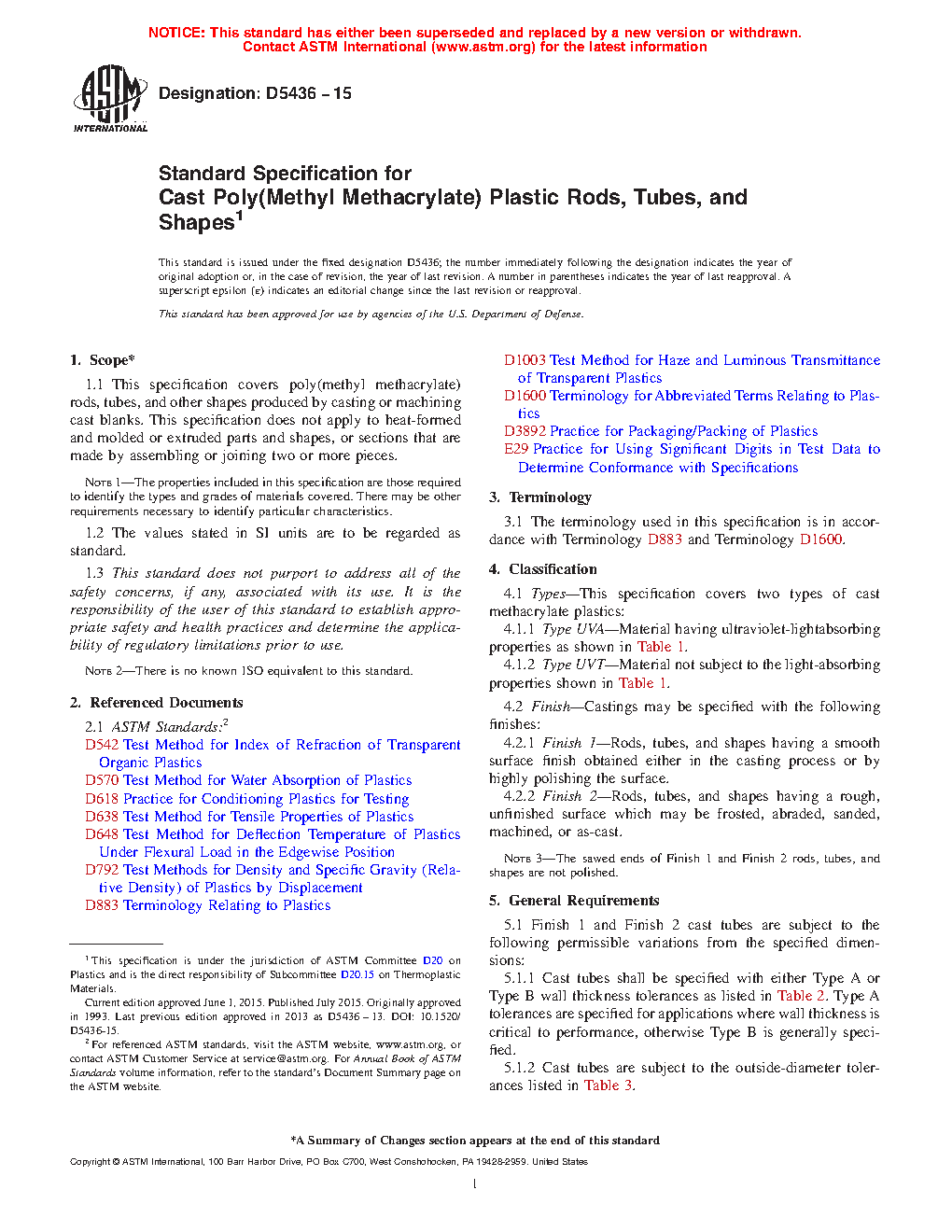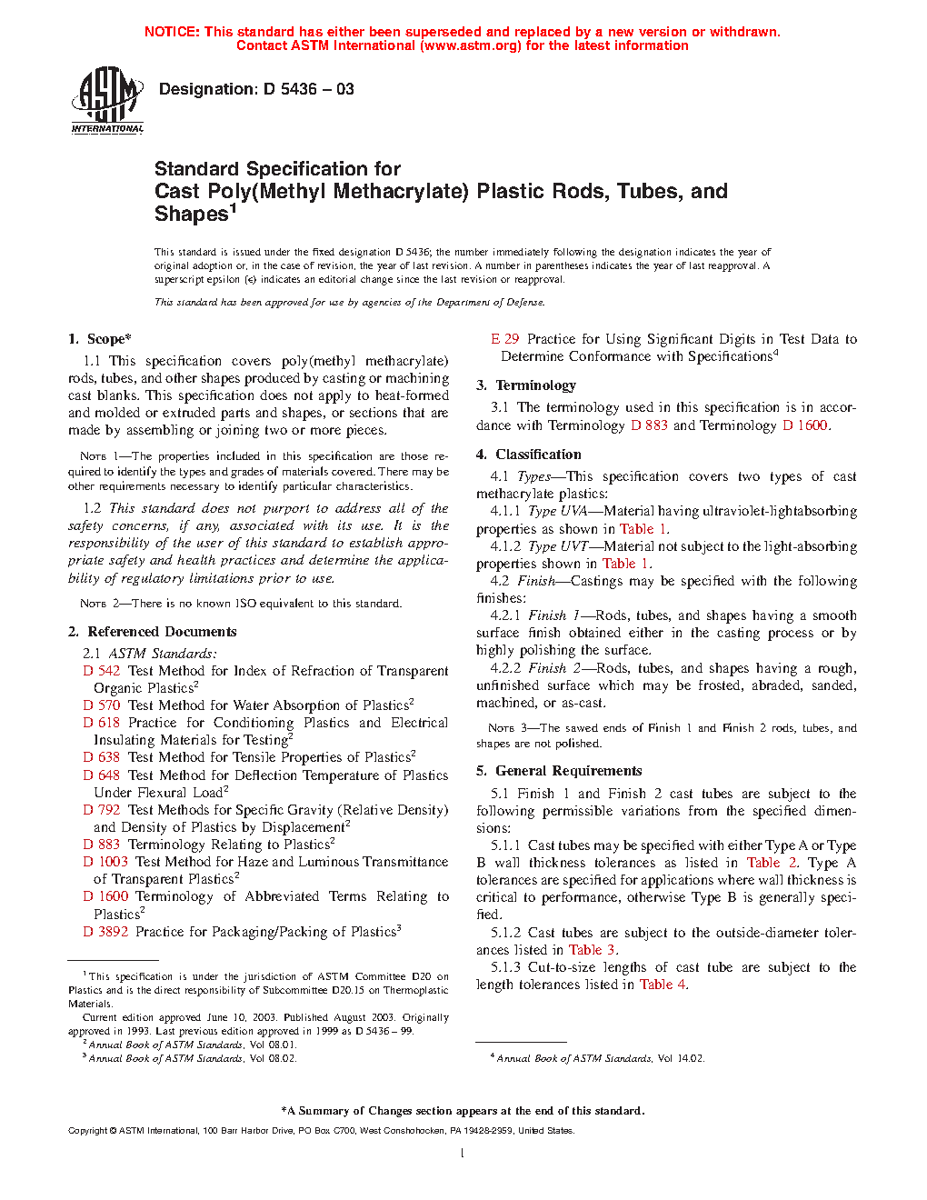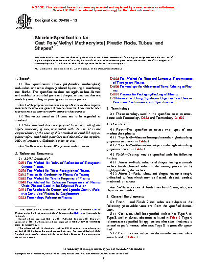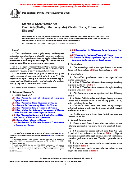 1.1 This specification covers poly(methyl methacrylate) rods, tubes, and other shapes produced by casting or machining cast blanks. This specification does not apply to heat-formed and molded or extruded parts and shapes, or sections that are made by assembling or joining two or more pieces.