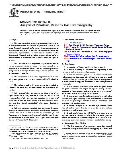 1.1 This test method covers the quantitative determination of the carbon number distribution of petroleum waxes in the range from n-C17 through n-C44 by gas chromatography using internal standardization. In addition, the content of normal and non-normal hydrocarbons for each carbon number is also determined. Material with a carbon number above n-C44 is determined by difference from 100 mass% and reported as C 45+ .