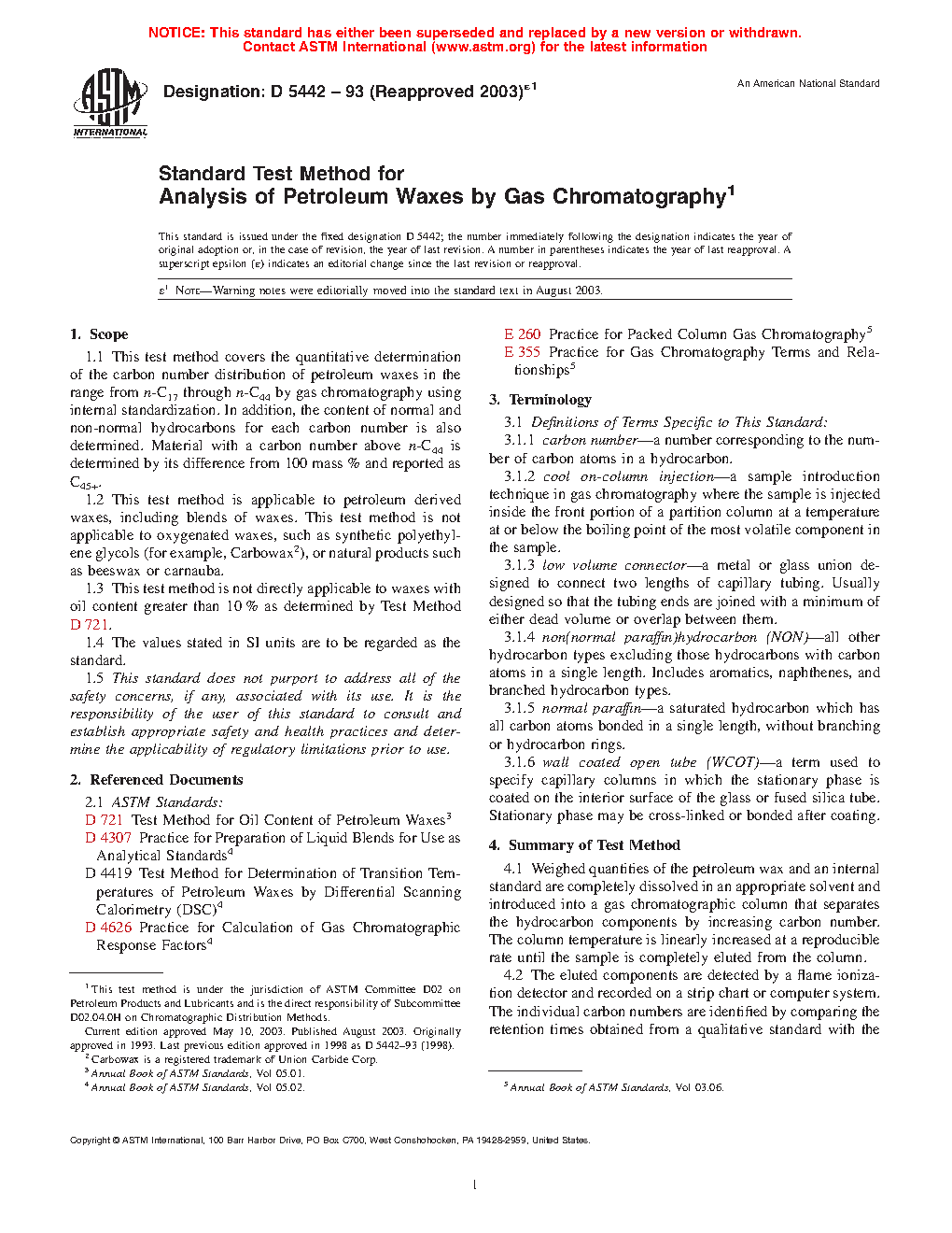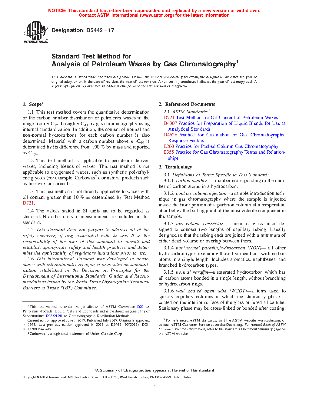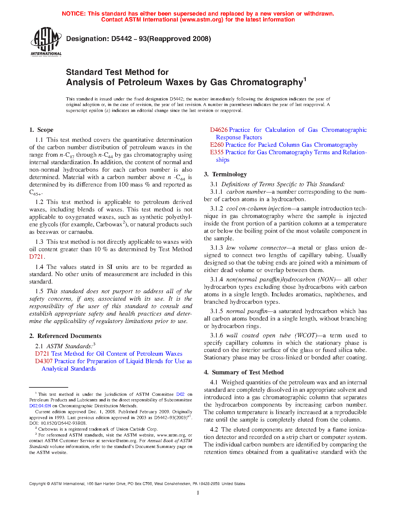 1.2 This test method is applicable to petroleum derived waxes, including blends of waxes. This test method is not applicable to oxygenated waxes, such as synthetic polyethylene glycols (for example, Carbowax ), or natural products such as beeswax or carnauba.