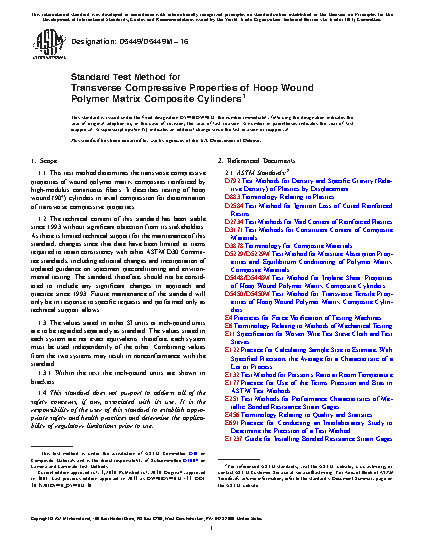 1.1 This test method determines the transverse compressive properties of wound polymer matrix composites reinforced by high-modulus continuous fibers. It describes testing of hoop wound (90o