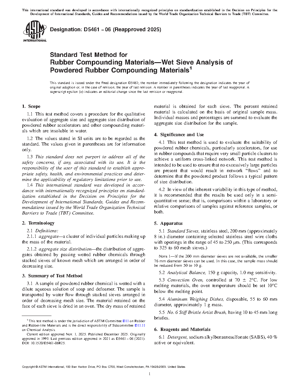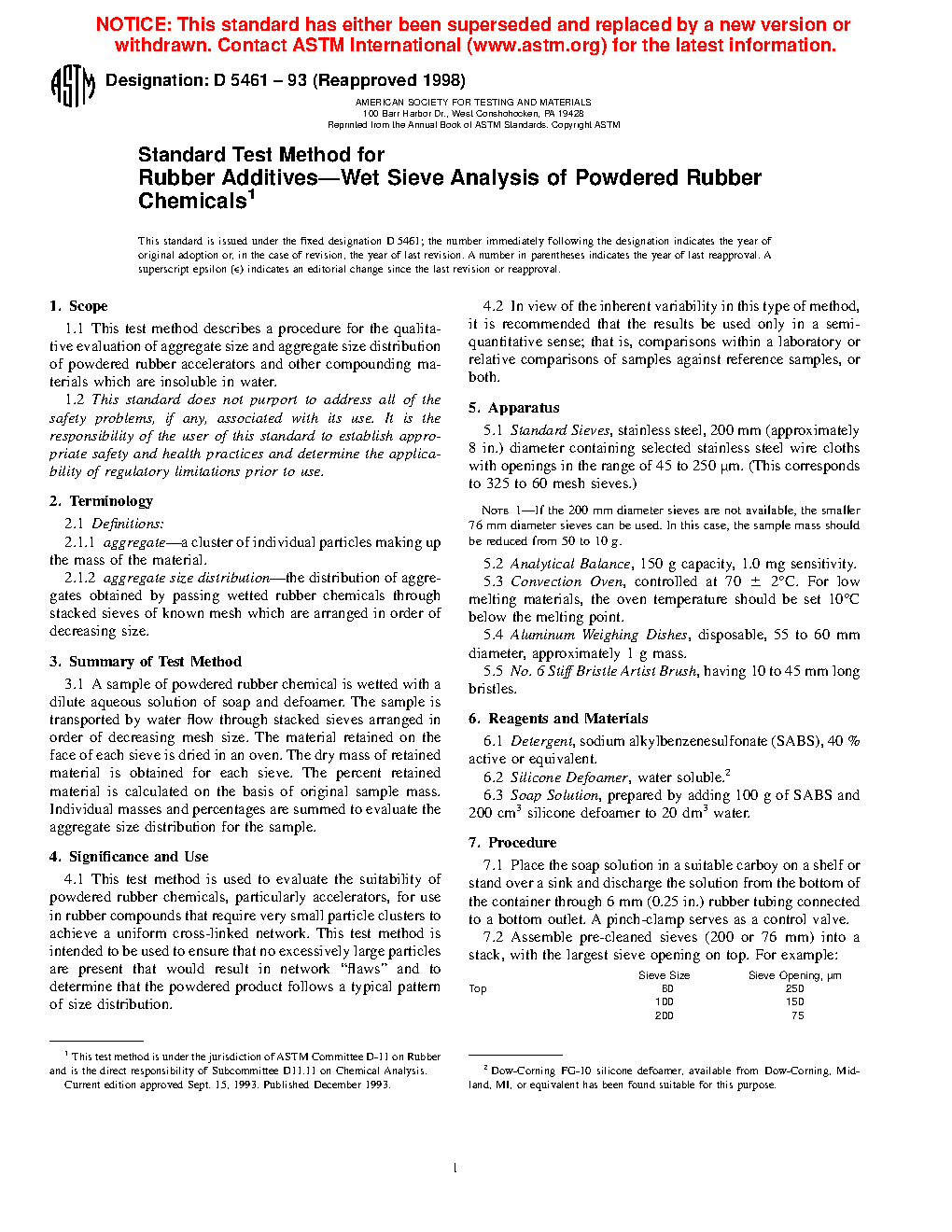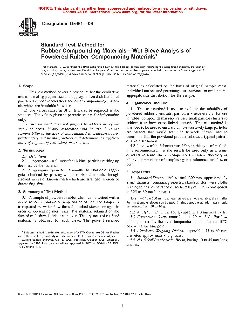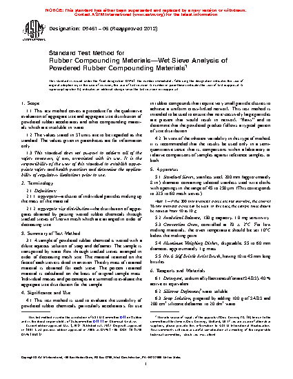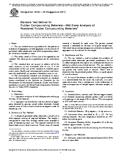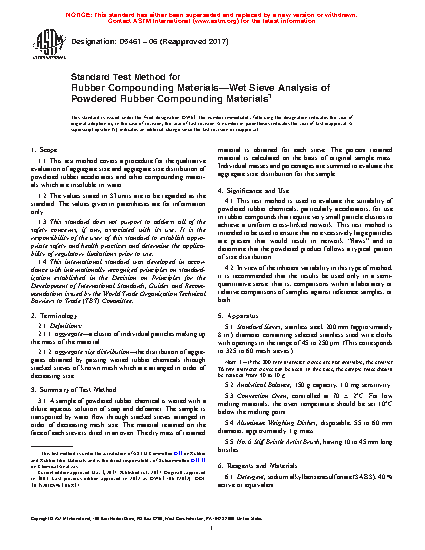4.1 This test method is used to evaluate the suitability of powdered rubber chemicals, particularly accelerators, for use in rubber compounds that require very small particle clusters to achieve a uniform cross-linked network. This test method is intended to be used to ensure that no excessively large particles are present that would result in network “flaws” and to determine that the powdered product follows a typical pattern of size distribution.