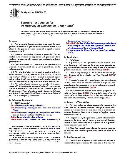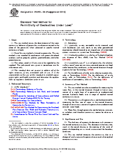 1.1 This test method covers the determination of the water permittivity behavior of geotextiles in a direction normal to the plane of the geotextile when subjected to specific normal compressive loads.