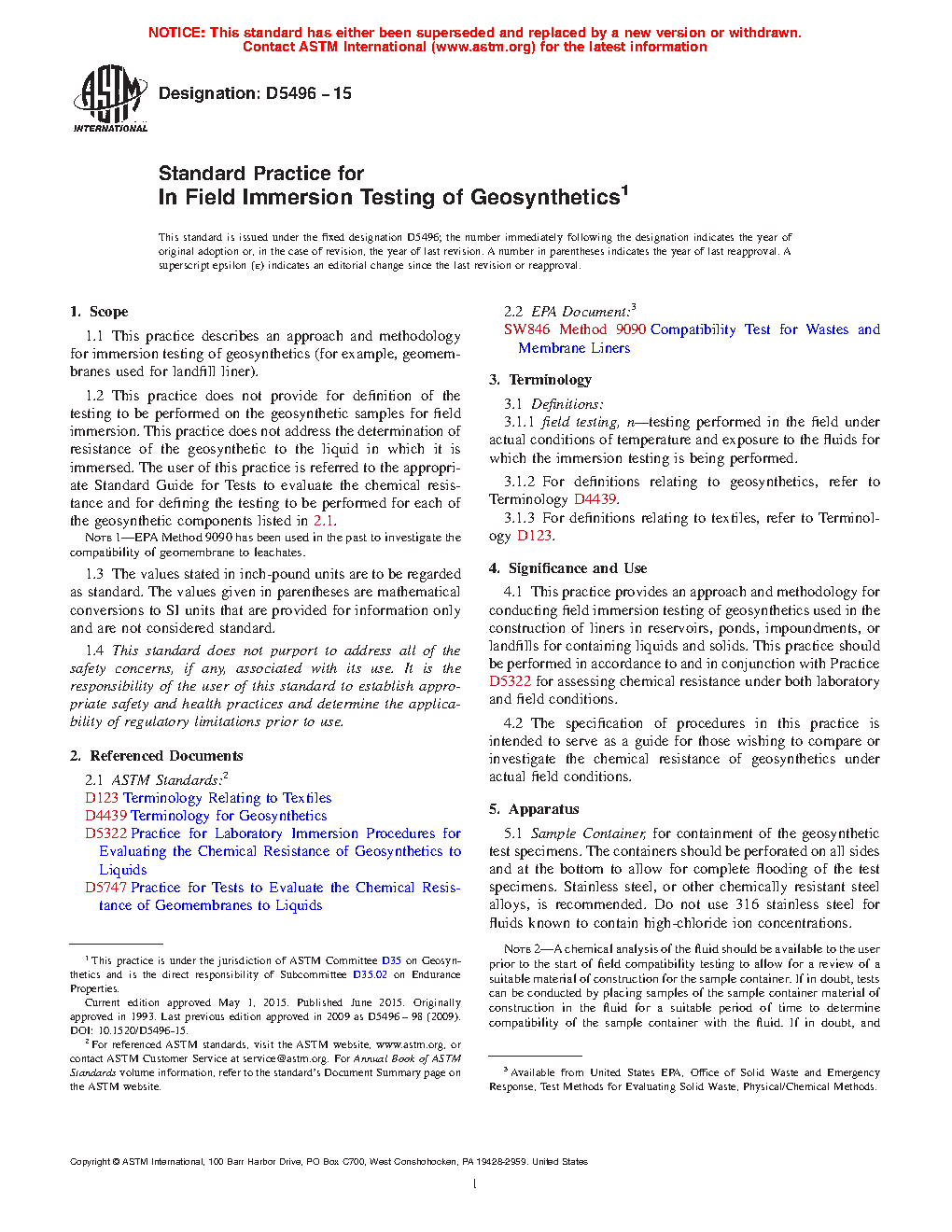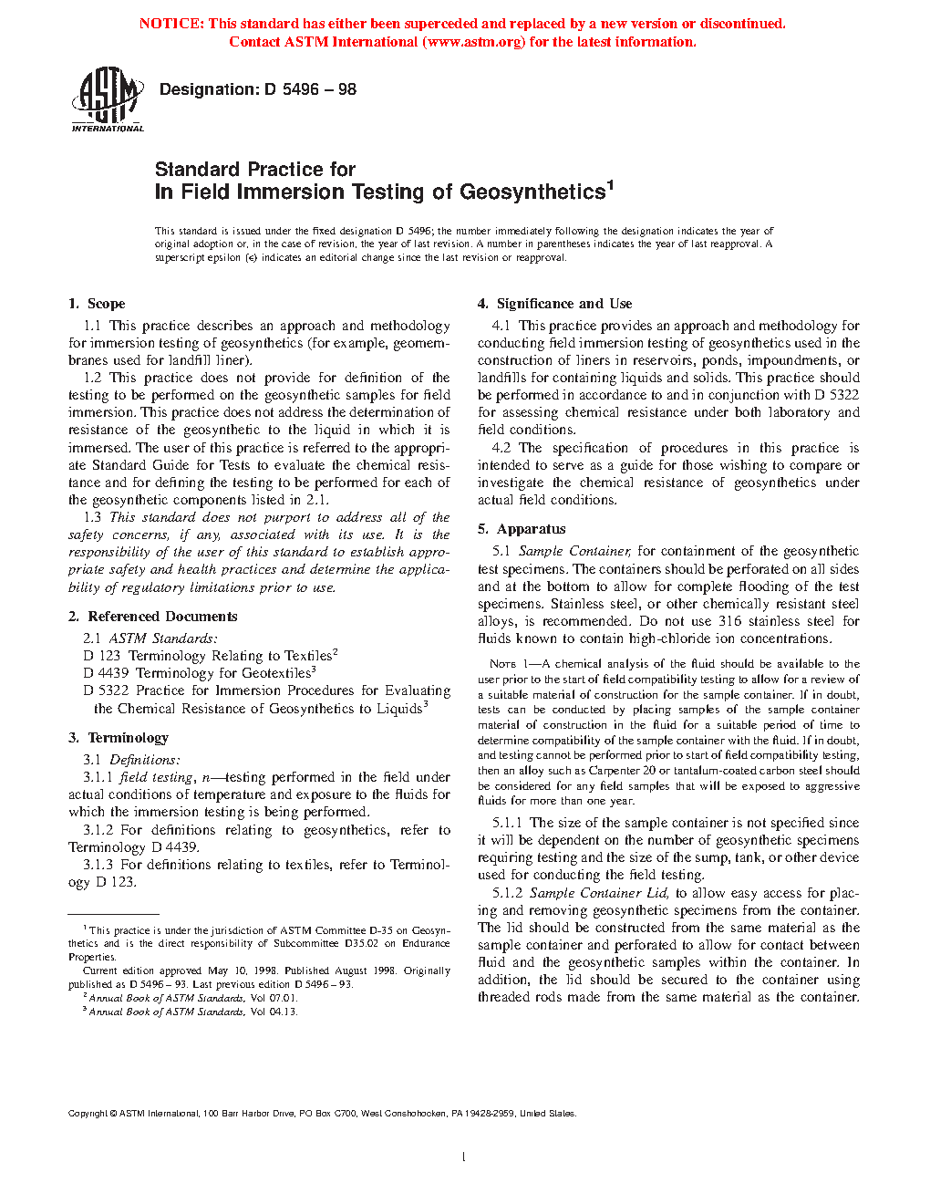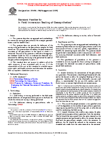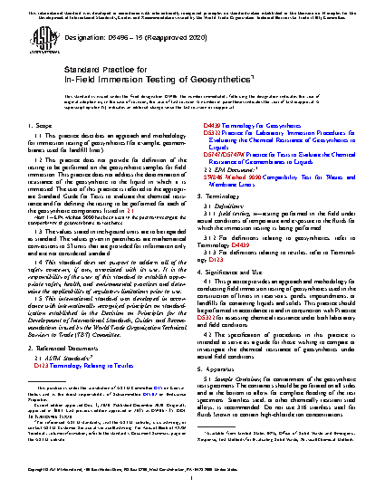 1.2 This practice does not provide for definition of the testing to be performed on the geosynthetic samples for field immersion. This practice does not address the determination of resistance of the geosynthetic to the liquid in which it is immersed. The user of this practice is referred to the appropriate Standard Guide for Tests to evaluate the chemical resistance and for defining the testing to be performed for each of the geosynthetic components listed in .