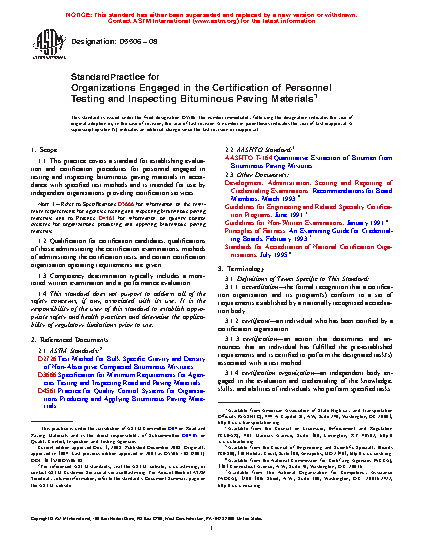 1.1 This practice covers a standard for establishing evaluation and certification procedures for personnel engaged in testing and inspecting bituminous paving materials in accordance with specified test methods and is intended for use by independent organizations providing certification services.