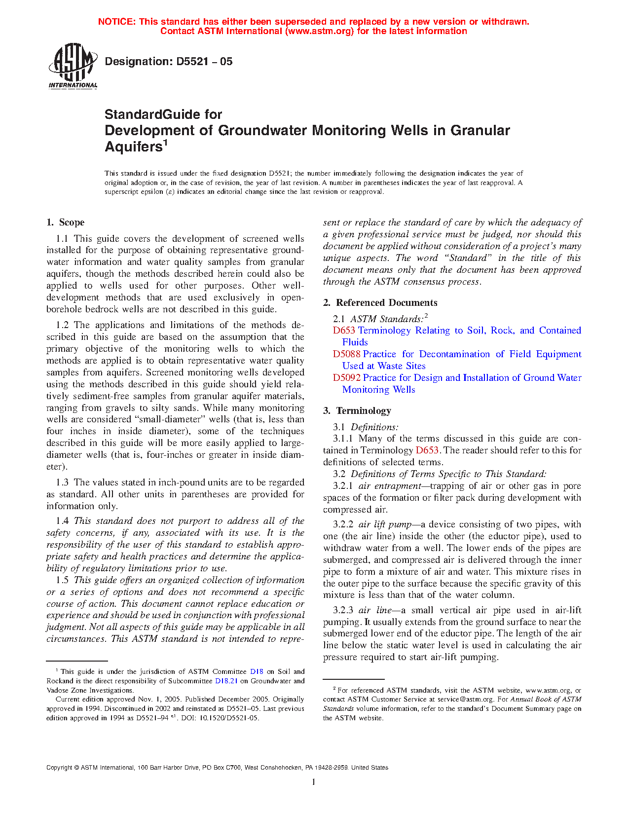 1.1 This guide covers the development of screened wells installed for the purpose of obtaining representative groundwater information and water quality samples from granular aquifers, though the methods described herein could also be applied to wells used for other purposes. Other well-development methods that are used exclusively in open-borehole bedrock wells are not described in this guide.