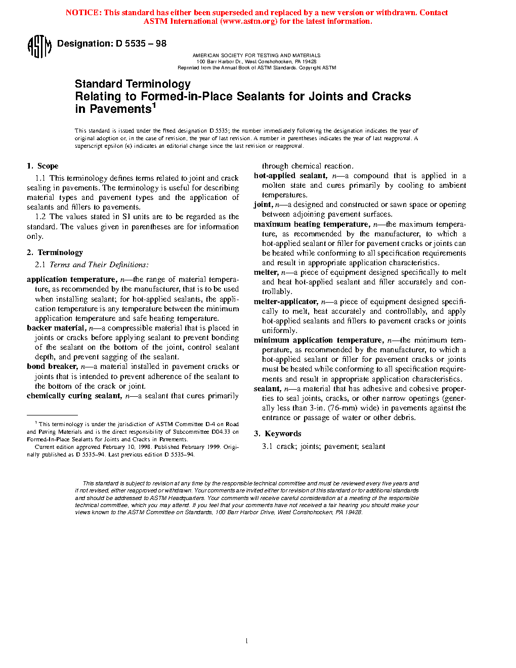 Standard Terminology Relating to Formed-in-Place Sealants for Joints and Cracks in Pavements (Withdrawn 2009)