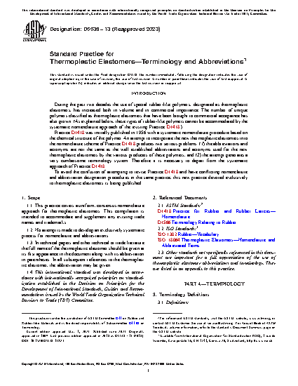1.3 In technical papers and other technical or trade literature the full name of the thermoplastic elastomer should be given at its first appearance in the document along with its abbreviation in parentheses. In all subsequent references to the thermoplastic elastomer, the abbreviation may be given.