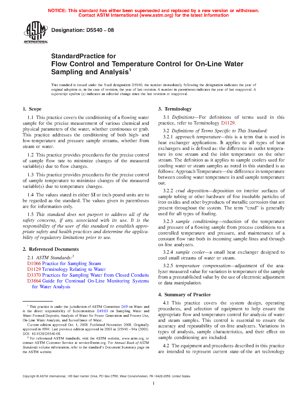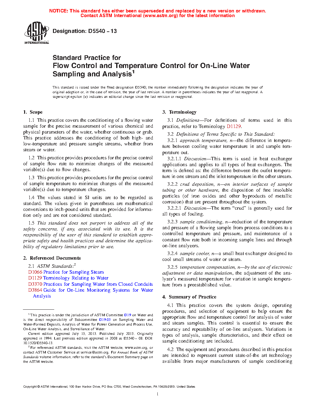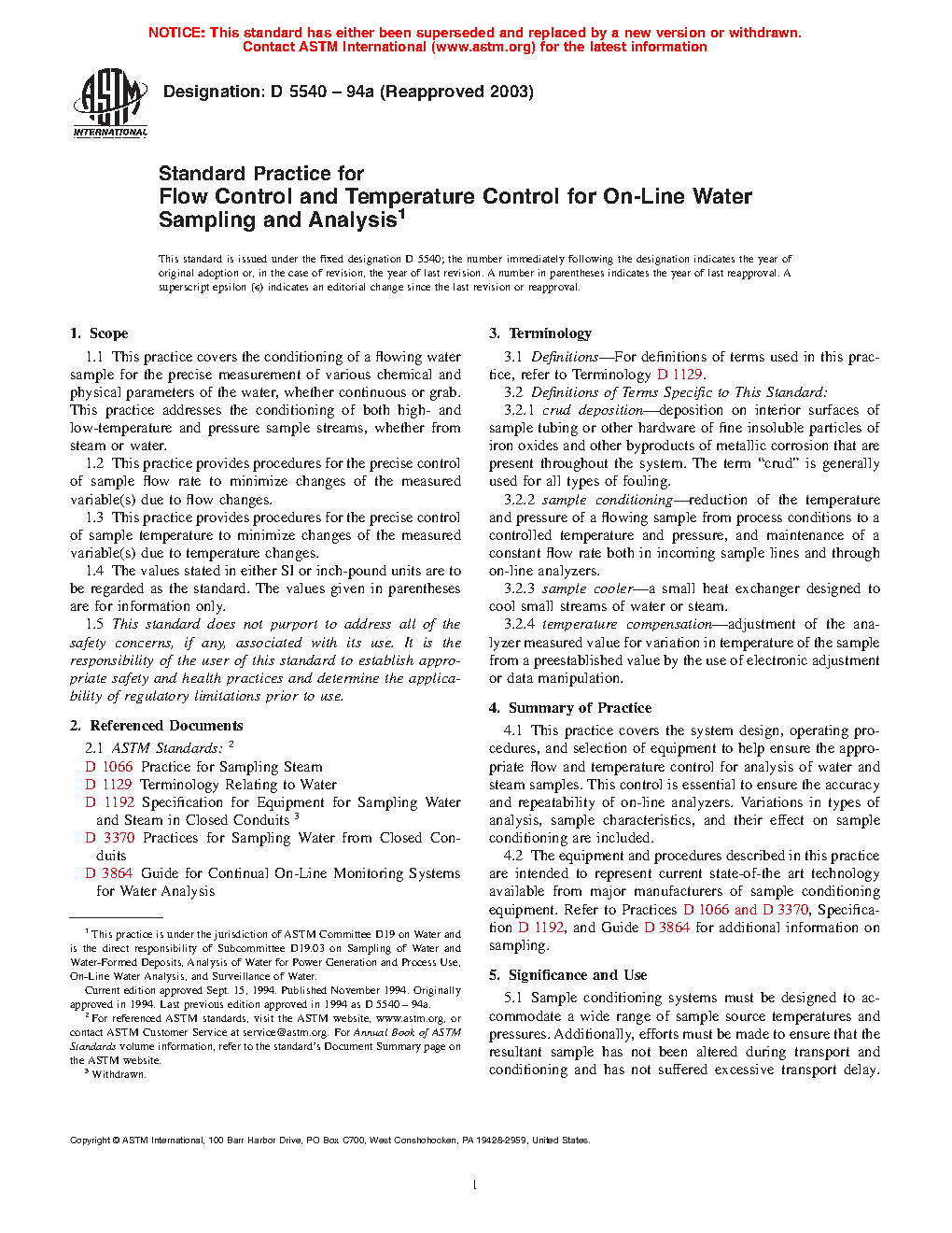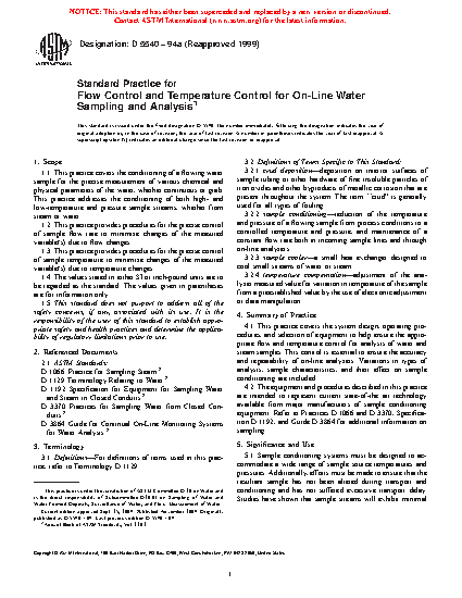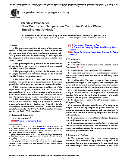 1.1 This practice covers the conditioning of a flowing water sample for the precise measurement of various chemical and physical parameters of the water, whether continuous or grab. This practice addresses the conditioning of both high- and low-temperature and pressure sample streams, whether from steam or water.