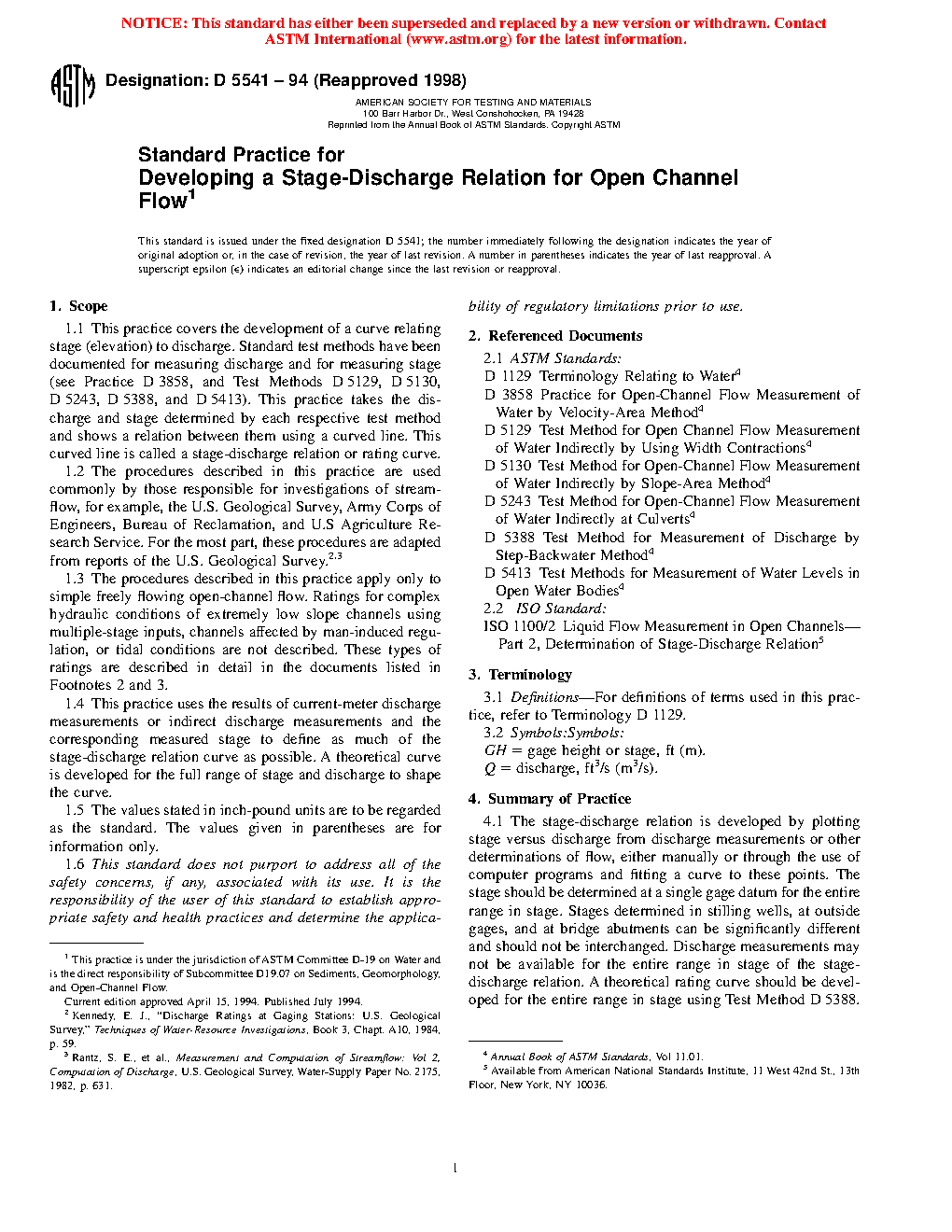 1.3 The procedures described in this practice apply only to simple freely flowing open-channel flow. Ratings for complex hydraulic conditions of extremely low slope channels using multiple-stage inputs, channels affected by man-induced regulation, or tidal conditions are not described. These types of ratings are described in detail in Refs (2) and (3).