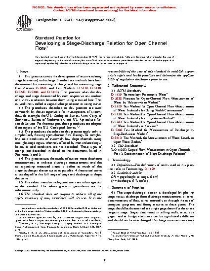 1.1 This practice covers the development of a curve relating stage (elevation) to discharge. Standard test methods have been documented for measuring discharge and for measuring stage (see Practice D3858, and Test Methods D5129, D5130, D5243, D5388, and D5413). This practice takes the discharge and stage determined by each respective test method and shows a relation between them using a curved line. This curved line is called a stage-discharge relation or rating curve.