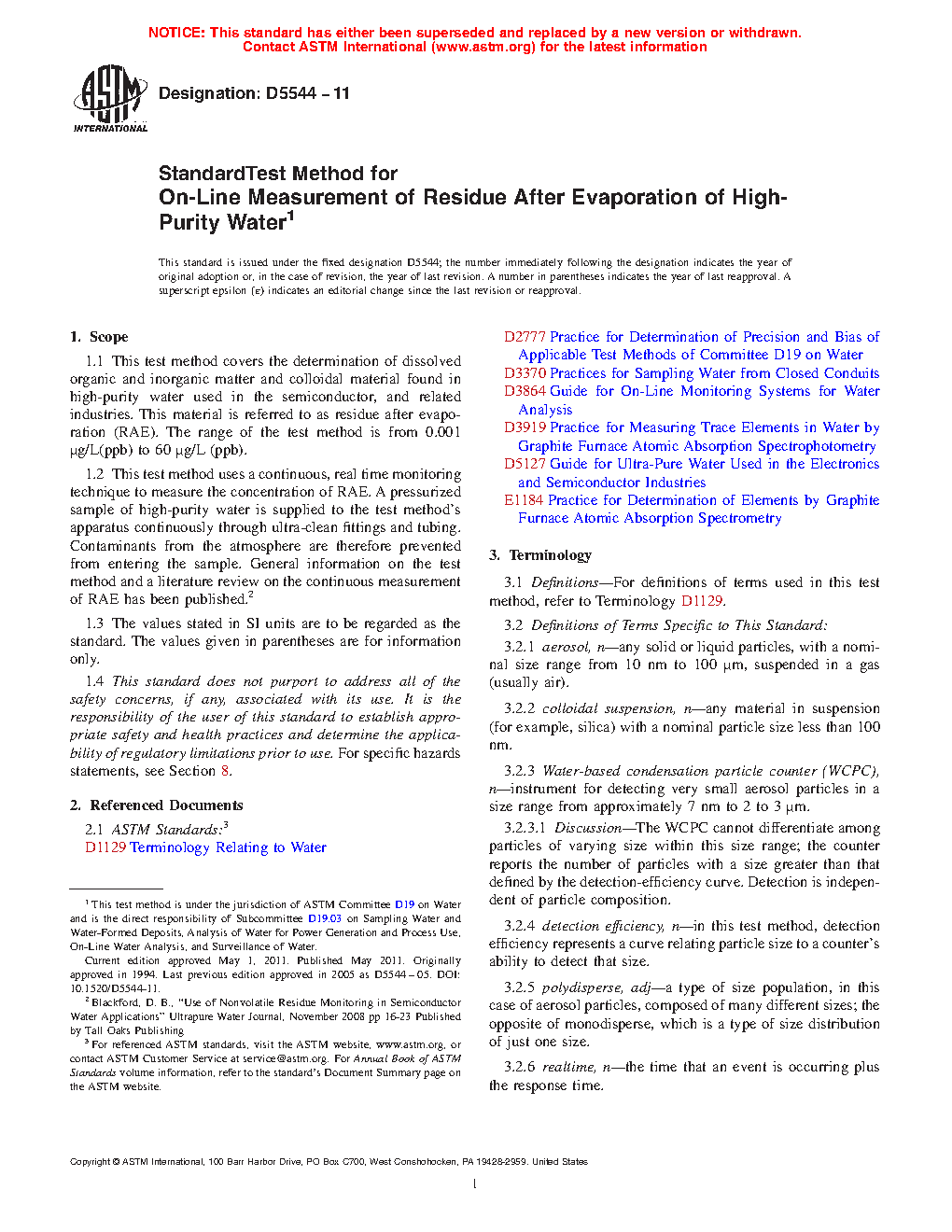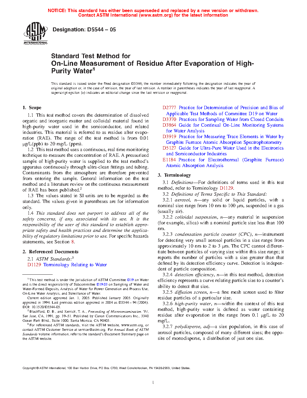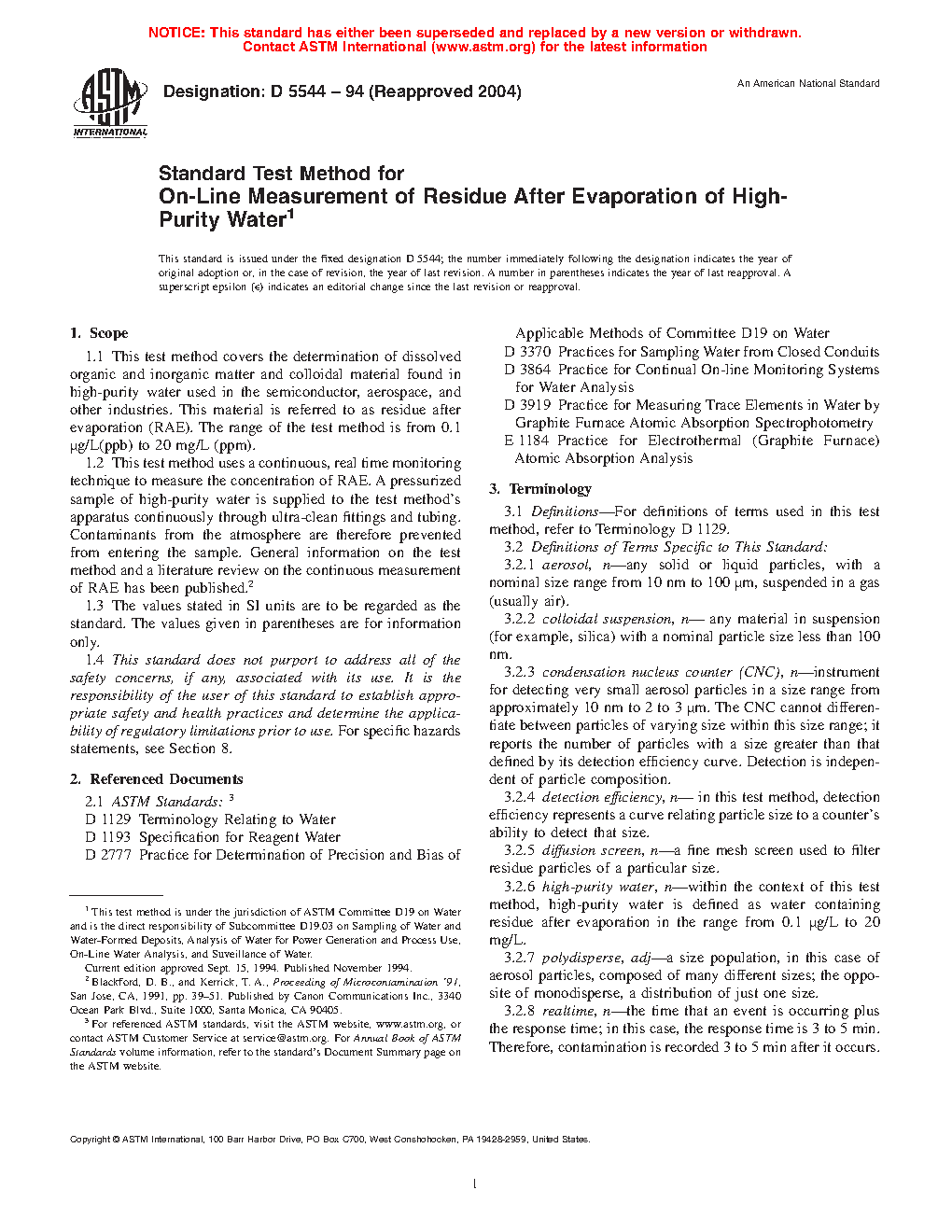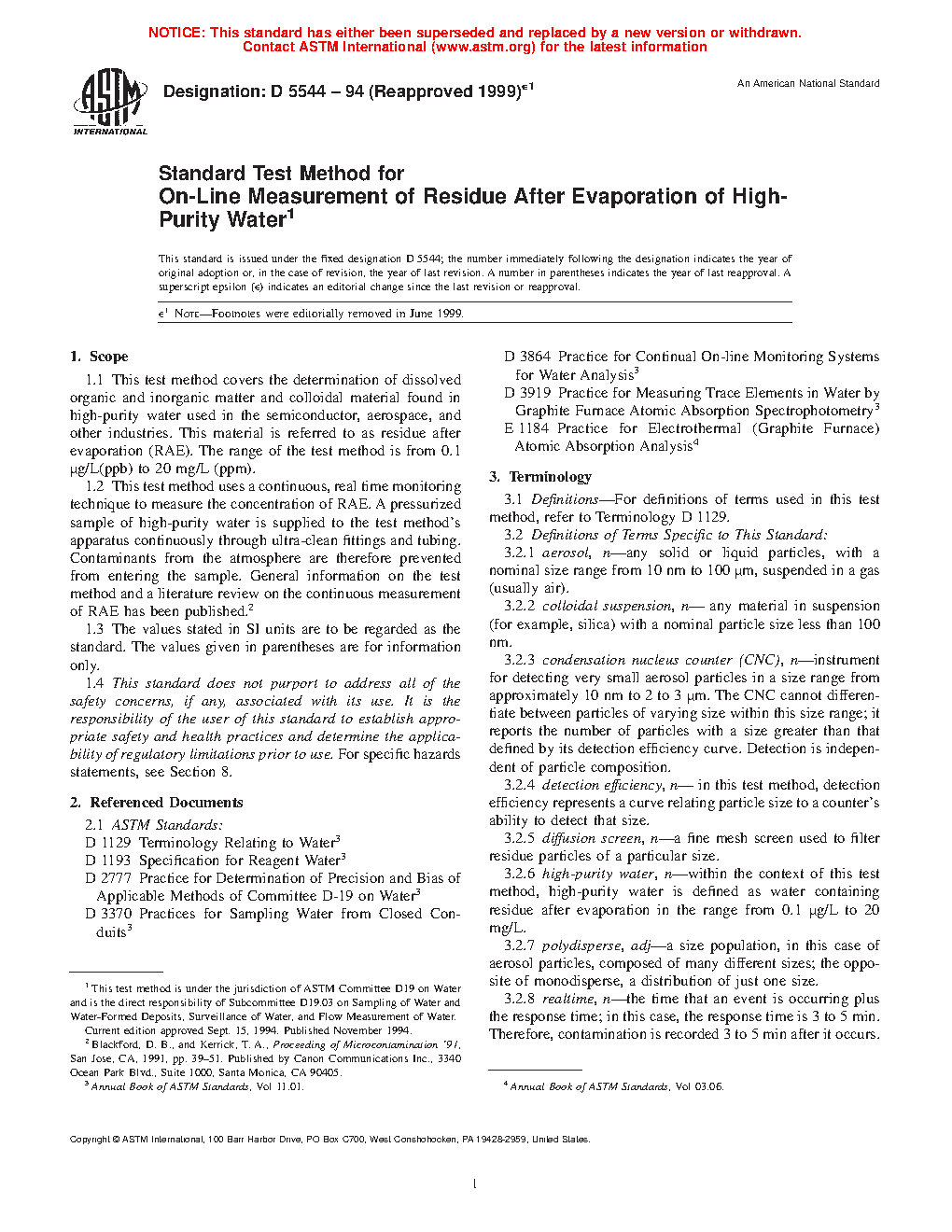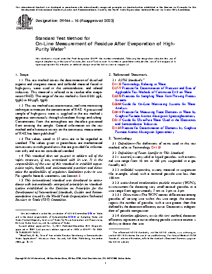 1.1 This test method covers the determination of dissolved organic and inorganic matter and colloidal material found in high-purity water used in the semiconductor, and related industries. This material is referred to as residue after evaporation (RAE). The range of the test method is from 0.001 µg/L (ppb) to 60 µg/L (ppb).