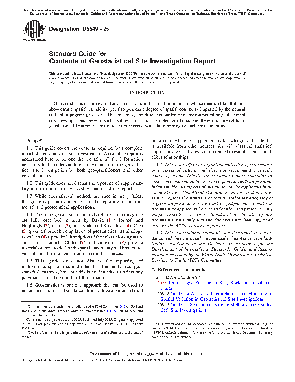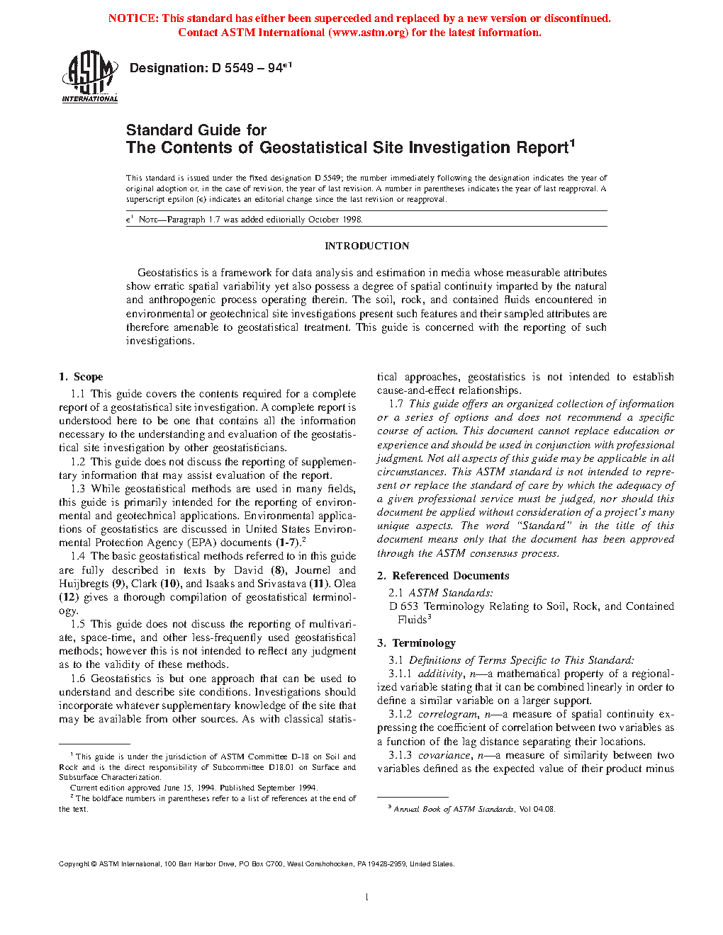 1.4 The basic geostatistical methods referred to in this guide are fully described in texts by David (1),2 Journel and Huijbregts (2), Clark (3), and Isaaks and Srivastava (4). Olea (5) gives a thorough compilation of geostatistical terminology as well as (6) a practical description of the subject for engineers and earth scientists. Chiles (7) and Goovaerts (8) provide material on how to deal with spatial uncertainty and how to use geostatistics for the evaluation of natural resources.