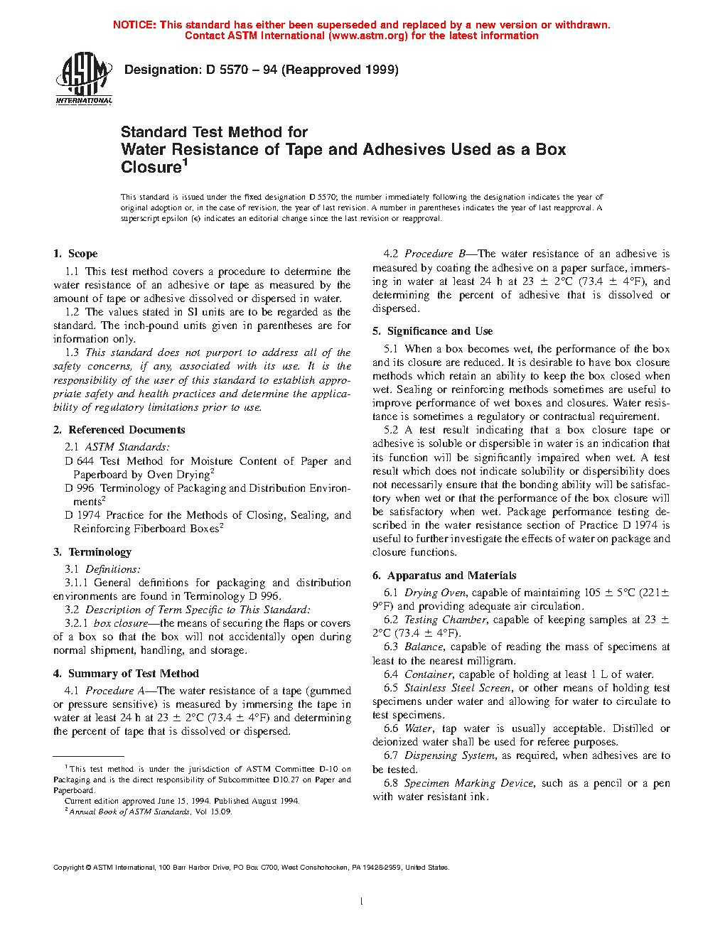A test result indicating that a box closure tape or adhesive is soluble or dispersible in water is an indication that its function will be significantly impaired when wet. A test result that does not indicate solubility or dispersibility does not necessarily ensure that the bonding ability will be satisfactory when wet or that the performance of the box closure will be satisfactory when wet. Package performance testing described in the water resistance section of Practice D 1974