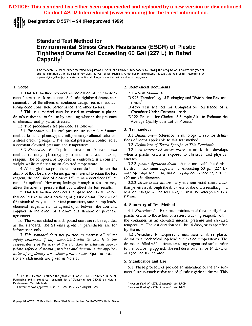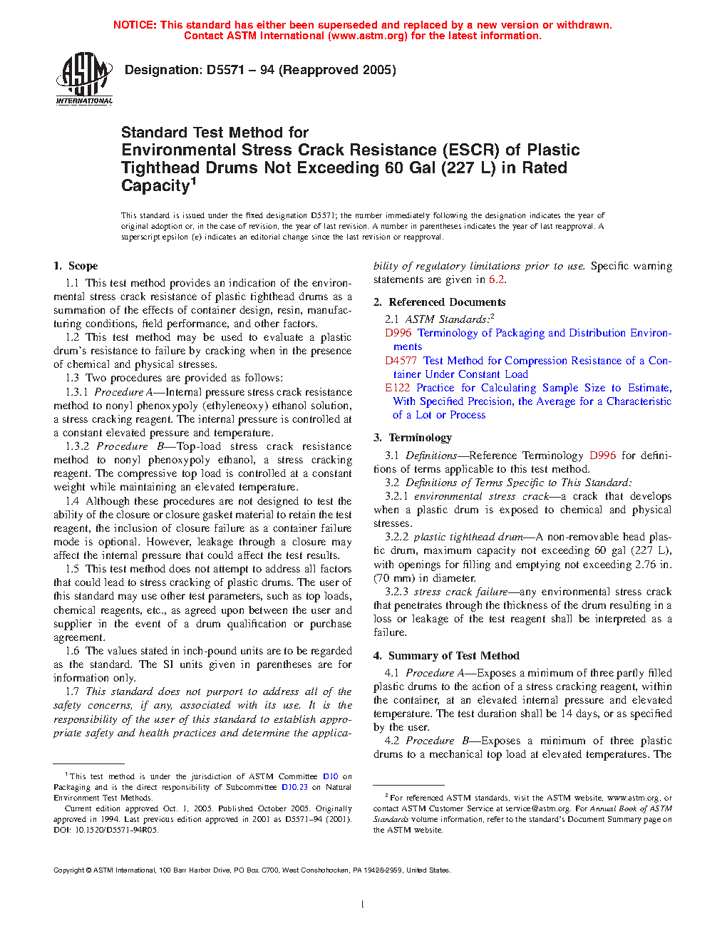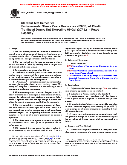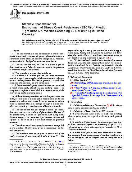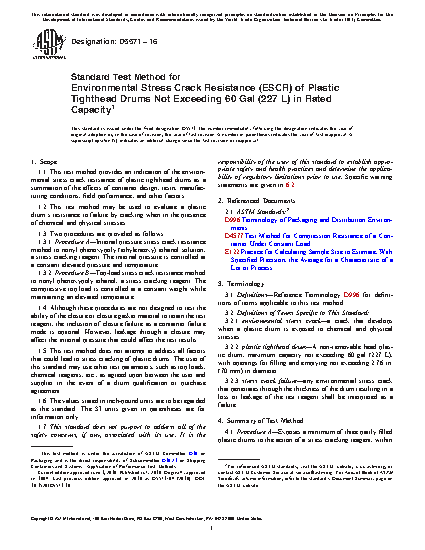 1.1 This test method provides an indication of the environmental stress crack resistance of plastic tighthead drums as a summation of the effects of container design, resin, manufacturing conditions, field performance, and other factors.
