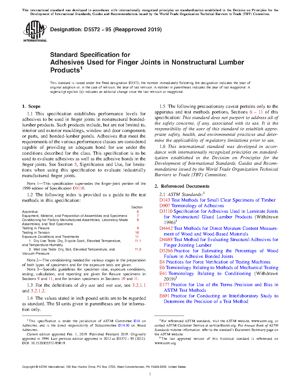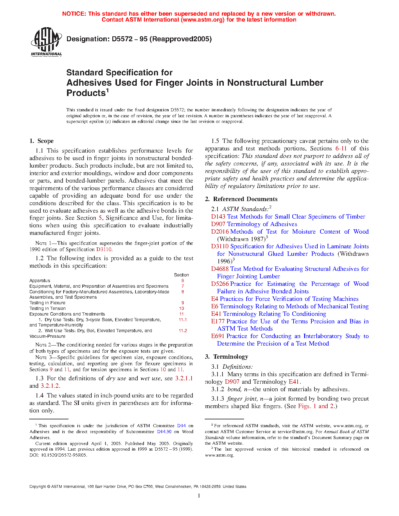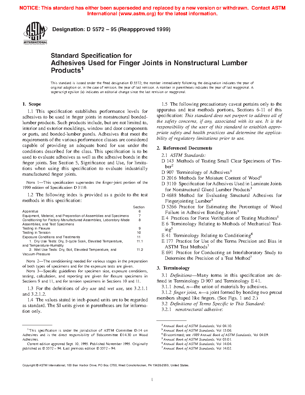 1.1 This specification establishes performance levels for adhesives to be used in finger joints in nonstructural bonded-lumber products. Such products include, but are not limited to, interior and exterior mouldings, window and door components or parts, and bonded-lumber panels. Adhesives that meet the requirements of the various performance classes are considered capable of providing an adequate bond for use under the conditions described for the class. This specification is to be used to evaluate adhesives as well as the adhesive bonds in the finger joints. See Section , Significance and Use, for limitations when using this specification to evaluate industrially manufactured finger joints. Note 1This specification supersedes the finger-joint portion of the 1990 edition of Specification D 3110.