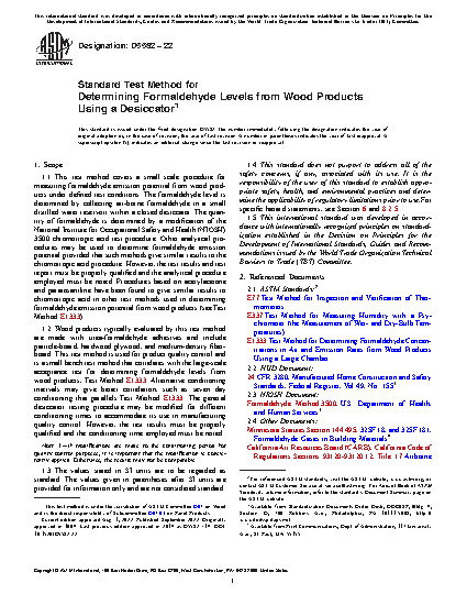 1.2 Wood products typically evaluated by this test method are made with urea-formaldehyde adhesives and include particleboard, hardwood, plywood, and medium-density fiberboard. This test method is used for product quality control and is a small bench test method that correlates with the large-scale acceptance test for determining formaldehyde levels from wood products, Test Method E1333. The general desiccator testing procedure may be modified for different conditioning times to accommodate its use in manufacturing quality control. However, the test results must be properly qualified and the conditioning time employed must be noted.
