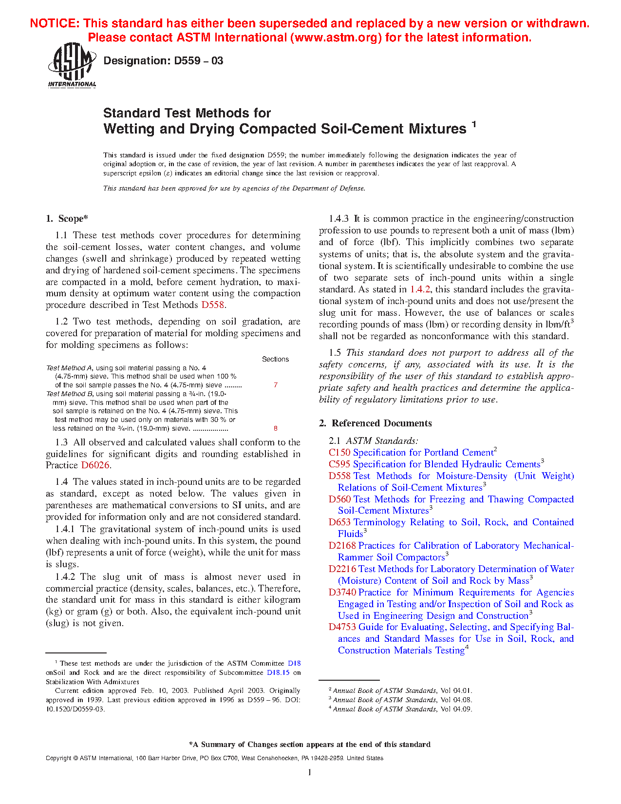 1.1 These test methods cover procedures for determining the soil-cement losses, water content changes, and volume changes (swell and shrinkage) produced by repeated wetting and drying of hardened soil-cement specimens. The specimens are compacted in a mold, before cement hydration, to maximum density at optimum water content using the compaction procedure described in Test Methods D558.