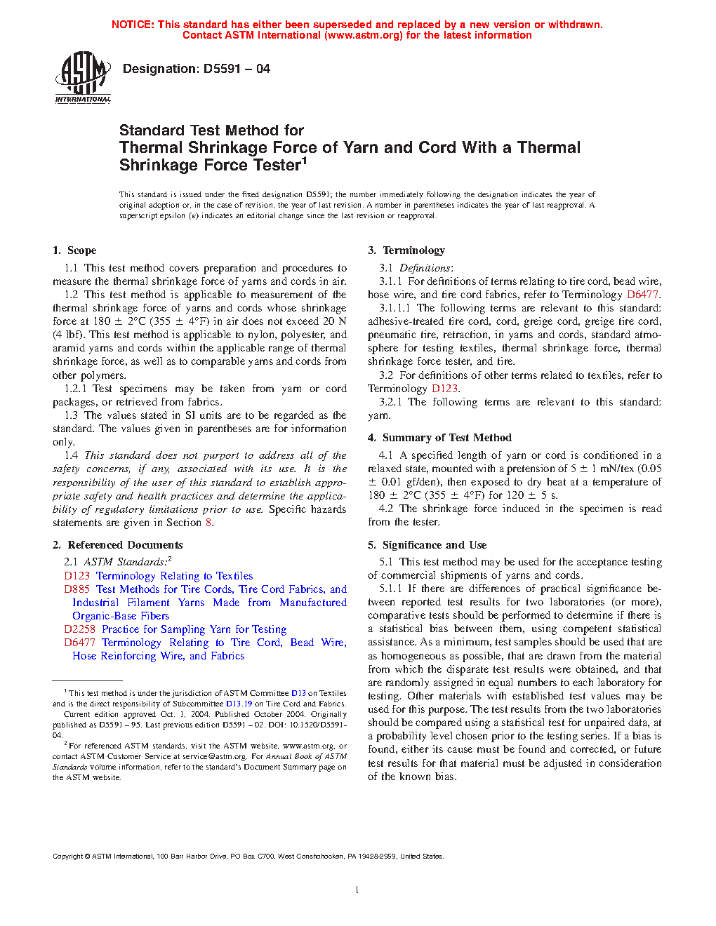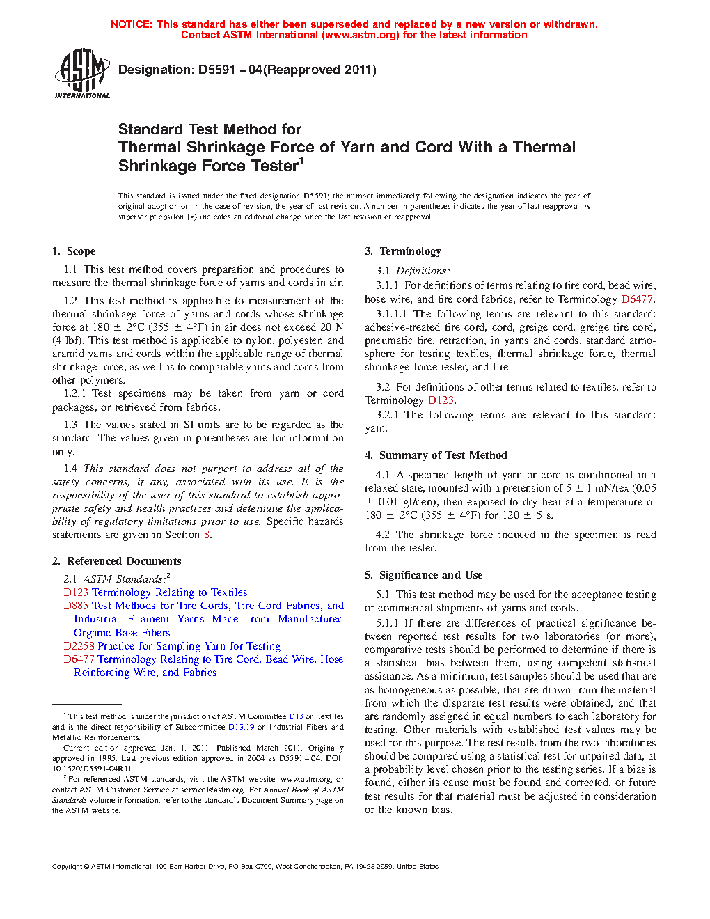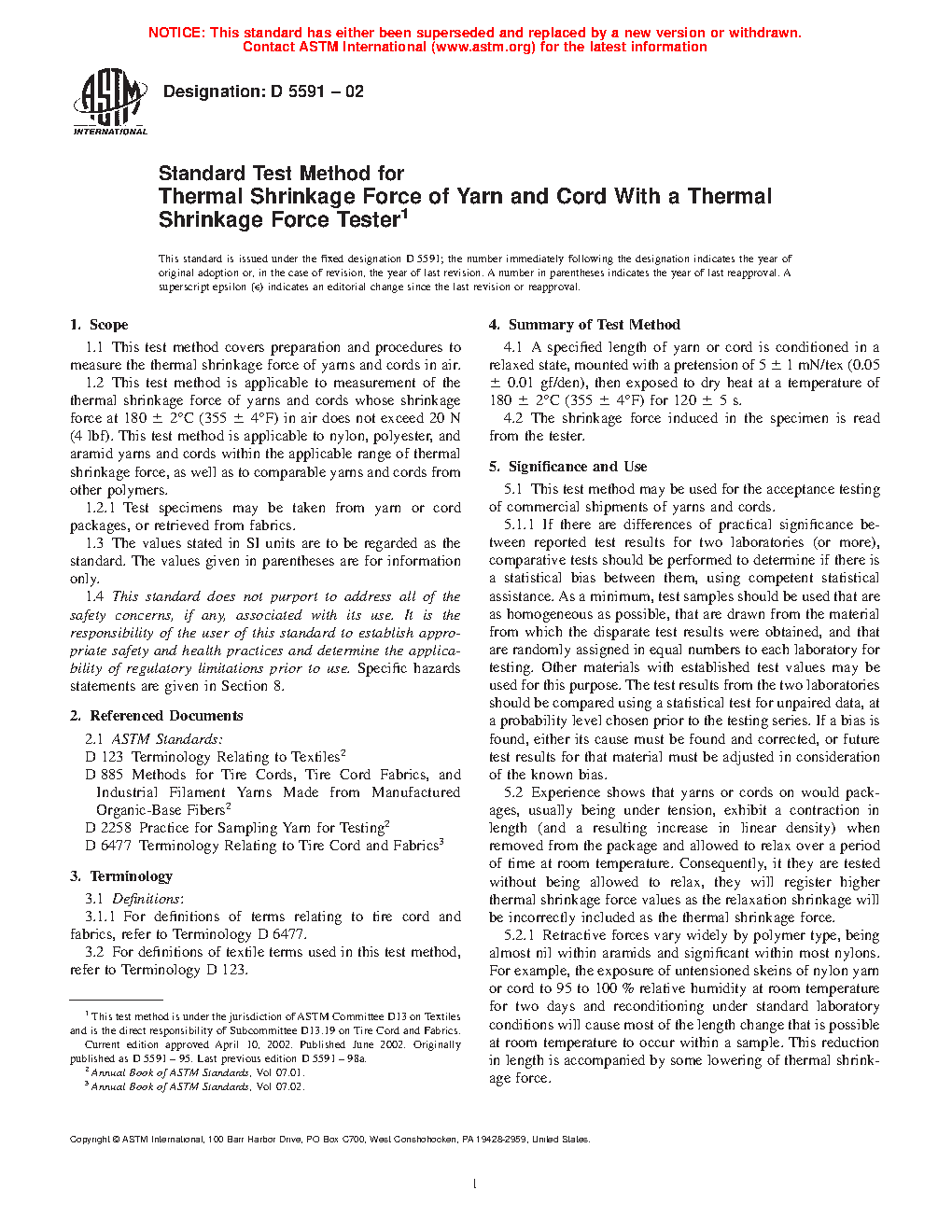 1.2 This test method is applicable to measurement of the thermal shrinkage force of yarns and cords whose shrinkage force at 180 ± 2°C (355 ± 4°F) in air does not exceed 20 N (4 lbf). This test method is applicable to nylon, polyester, and aramid yarns and cords within the applicable range of thermal shrinkage force, as well as to comparable yarns and cords from other polymers.