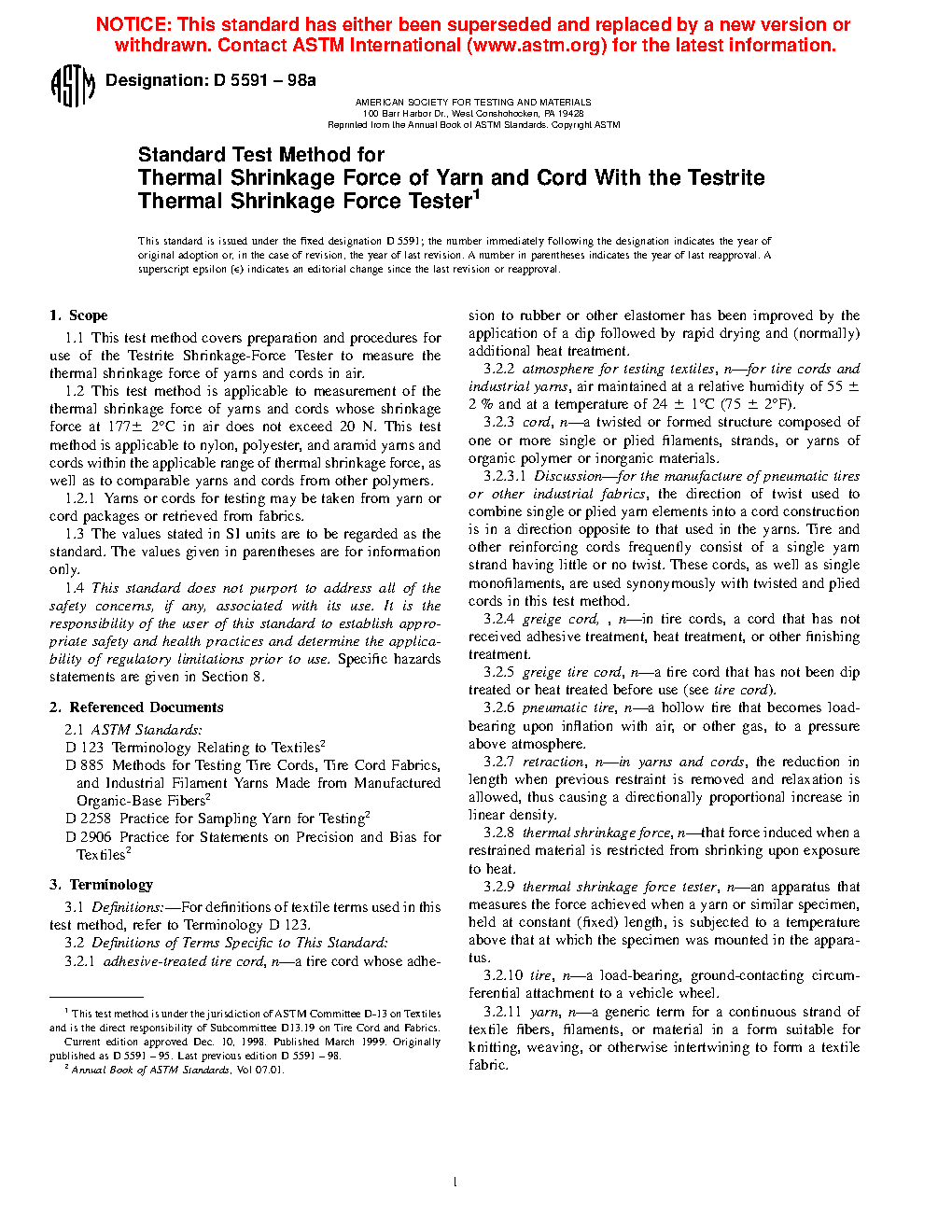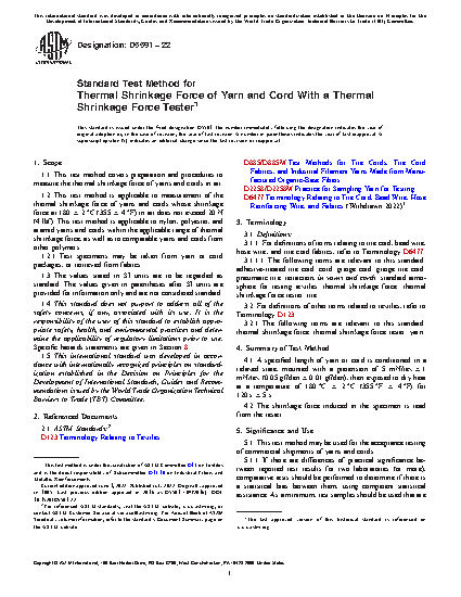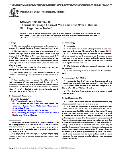 1.1 This test method covers preparation and procedures to measure the thermal shrinkage force of yarns and cords in air.