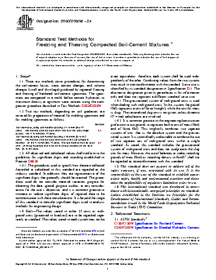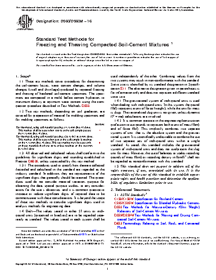 1.1 These test methods cover procedures for determining the soil-cement losses, water content changes, and volume changes (swell and shrinkage) produced by repeated freezing and thawing of hardened soil-cement specimens. The specimens are compacted in a mold, before cement hydration, to maximum density at optimum water content using the compaction procedure described in Test Methods D558/D558M.