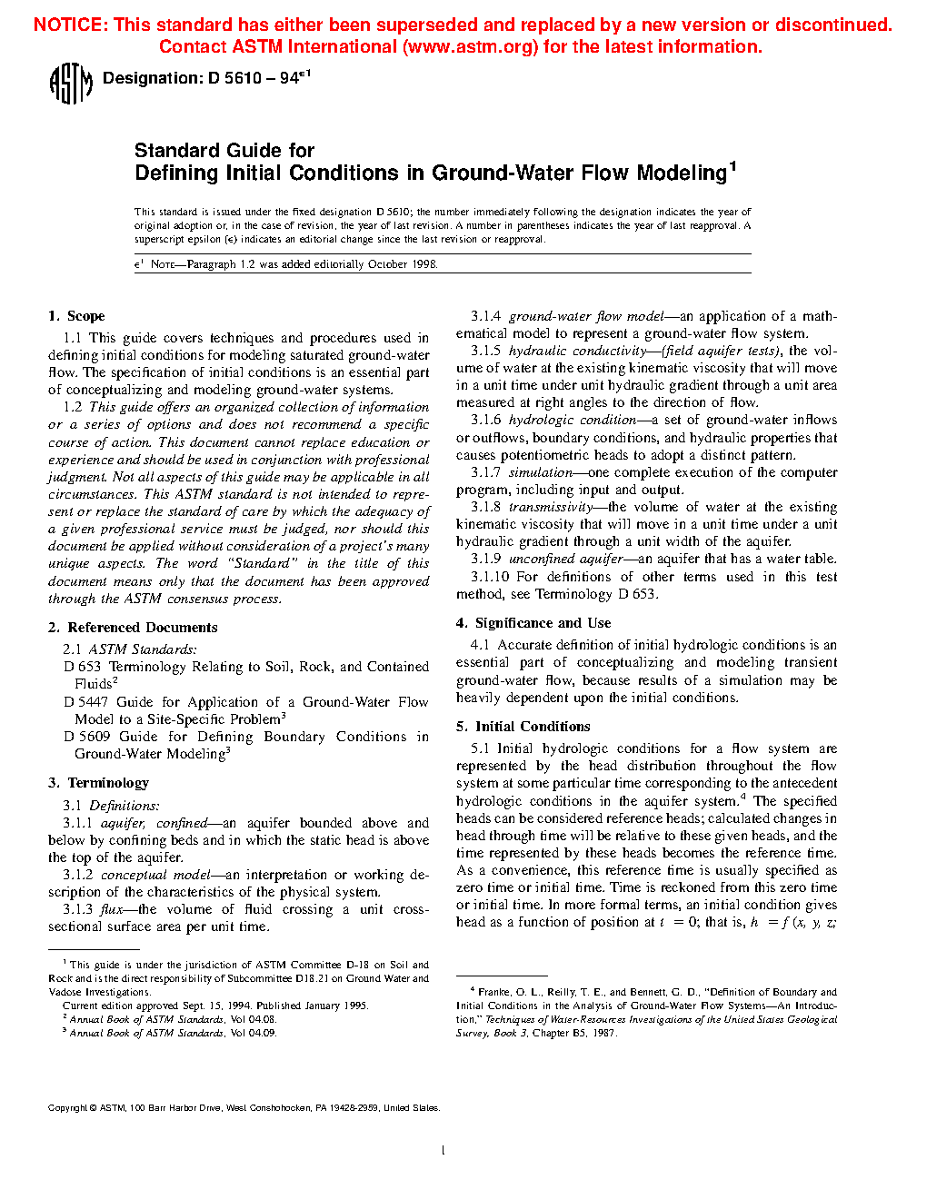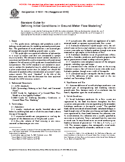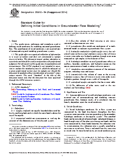 1.1 This guide covers techniques and procedures used in defining initial conditions for modeling saturated groundwater flow. The specification of initial conditions is an essential part of conceptualizing and modeling groundwater systems.