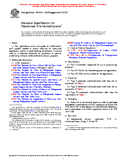 This specification covers the grades of trichloroethylene typically needed in various industries for noncritical applications such as in metal cleaning formulations. It may also be used as a reference document by purchasers or persons establishing in-house trichloroethylene recovery programs. The specimens are classified into three types: Type I – generally recognized for use in precision applications; Type II – for use in less-demanding precision applications; and Type III – may not be suitable for all applications. The three types of reclaimed trichloroethylene shall meet the specific gravity, nonvolatile residue, water content, assay percentage, 1,1,1 trichloroethane content, color in platinum-cobalt scale, appearance, acid acceptance, and acidity requirements.