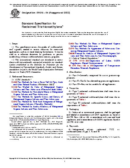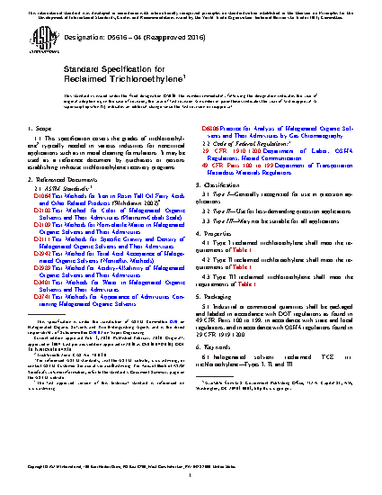 1.1 This specification covers the grades of trichloroethylene2 typically needed in various industries for noncritical applications such as in metal cleaning formulations. It may be used as a reference document by purchasers or persons establishing in-house trichloroethylene recovery programs.