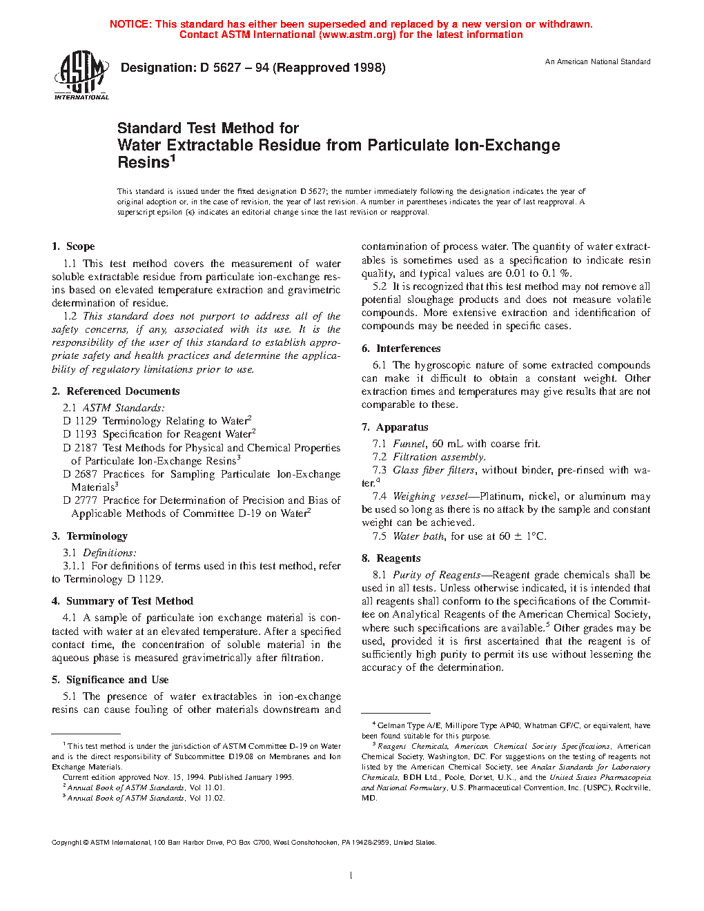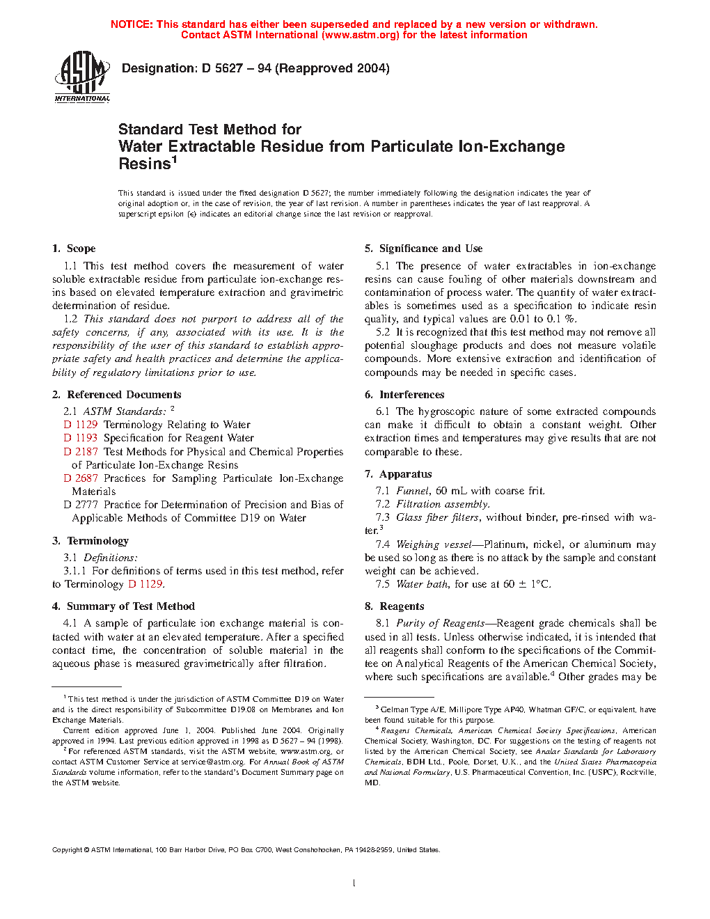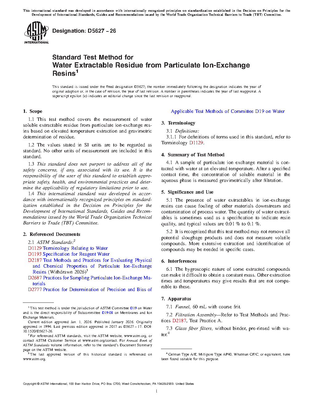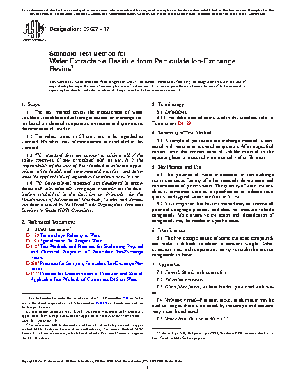 1.1 This test method covers the measurement of water soluble extractable residue from particulate ion-exchange resins based on elevated temperature extraction and gravimetric determination of residue.