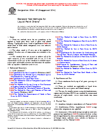 1.1 These test methods cover the test procedures to be applied to liquid paint driers used in paints and related coatings. Typical paint driers, listed in Specification D600, are carboxylates of lead, cobalt, manganese, zinc, iron, calcium, and zirconium.