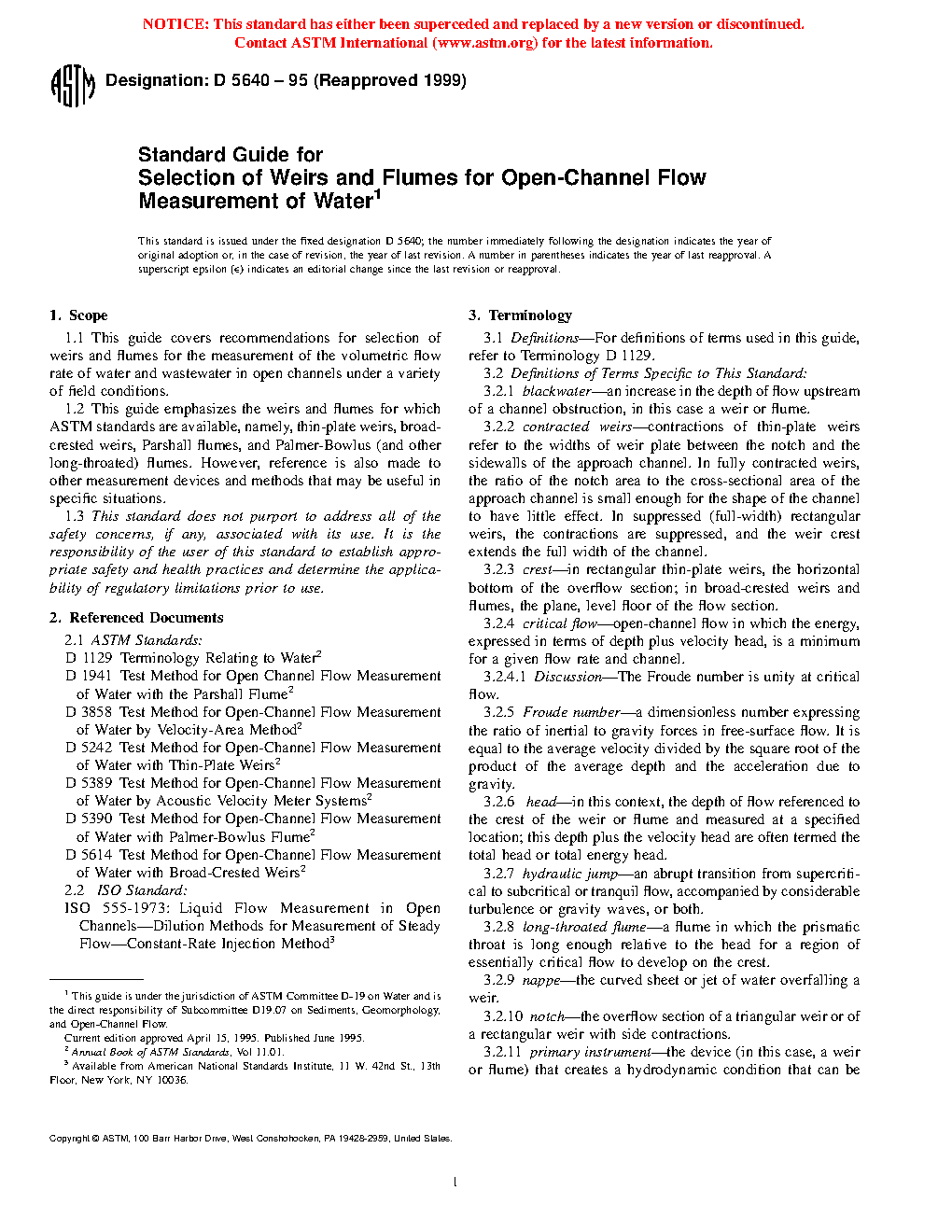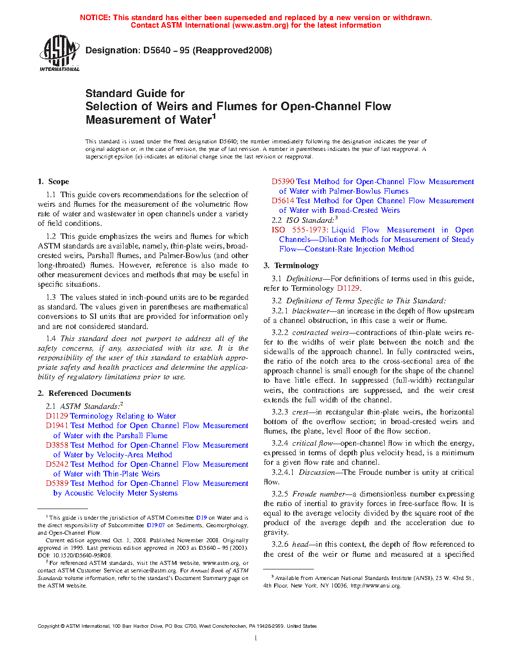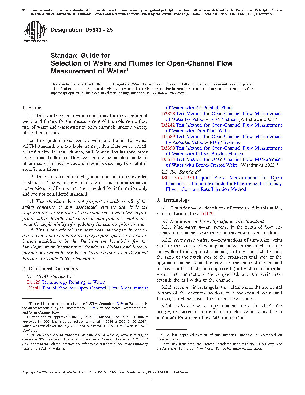 1.2 This guide emphasizes the weirs and flumes for which ASTM standards are available, namely, thin-plate weirs, broad-crested weirs, Parshall flumes, and Palmer-Bowlus (and other long-throated) flumes. However, reference is also made to other measurement devices and methods that may be useful in specific situations.
