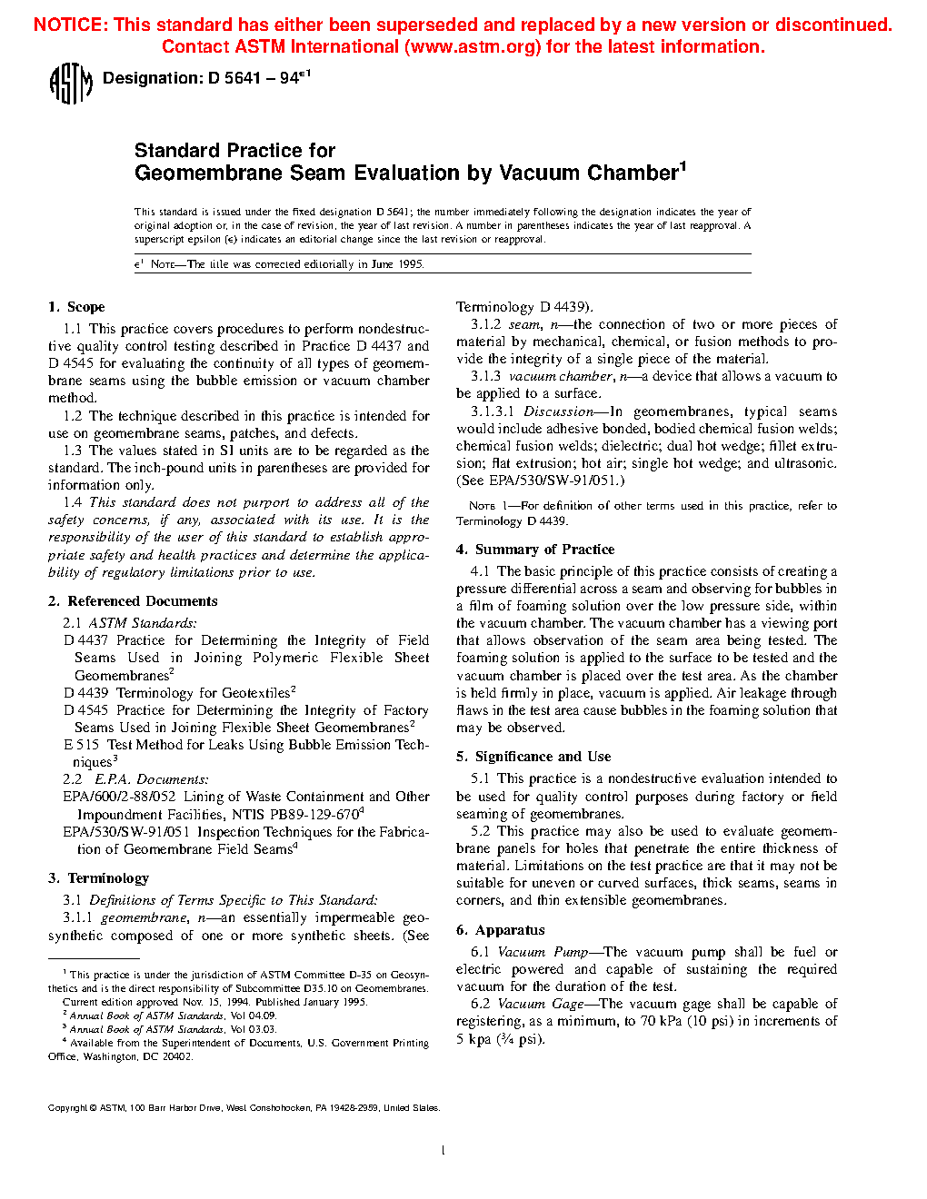 1.1 This practice covers procedures to perform nondestructive quality control testing described in Practice D4437 and D4545 for evaluating the continuity of all types of geomembrane seams using the bubble emission or vacuum chamber method.