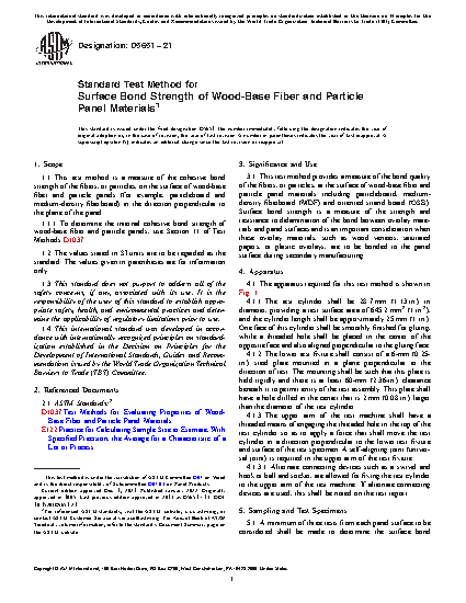 1.1 This test method is a measure of the cohesive bond strength of the fibers, or particles, on the surface of wood-base fiber and particle panels (for example, particleboard and medium-density fiberboard) in the direction perpendicular to the plane of the panel.