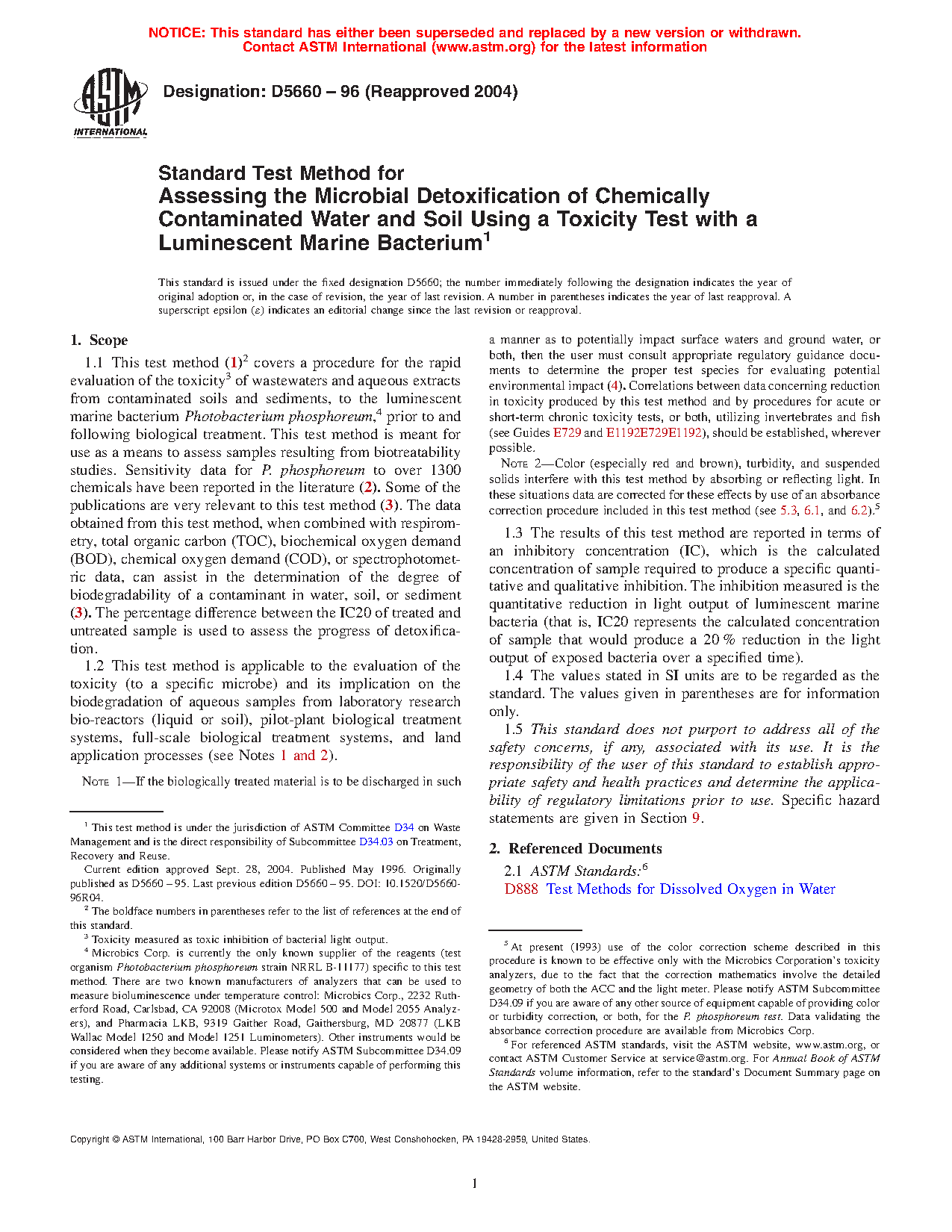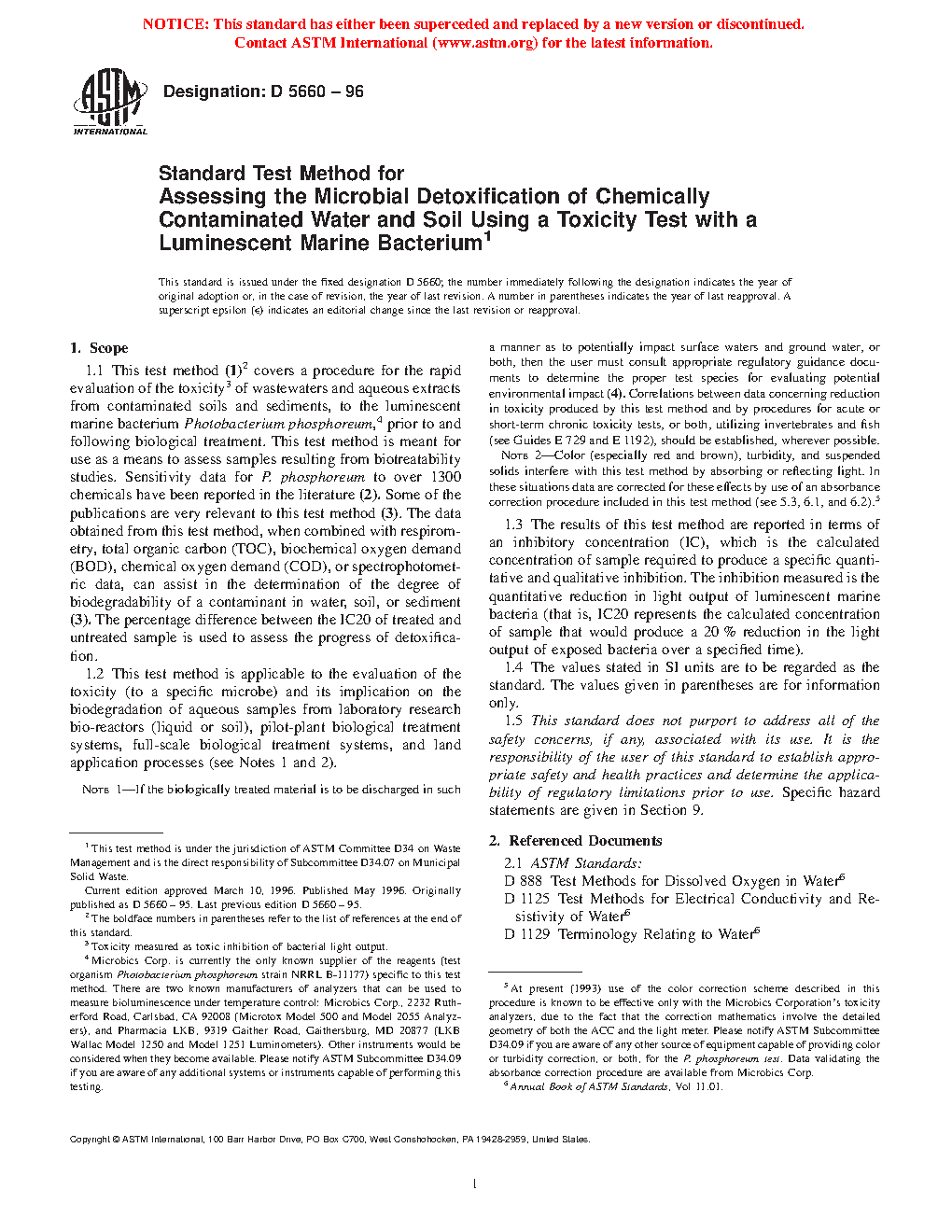 1.1 This test method (1) covers a procedure for the rapid evaluation of the toxicity of wastewaters and aqueous extracts from contaminated soils and sediments, to the luminescent marine bacterium Photobacterium phosphoreum, prior to and following biological treatment. This test method is meant for use as a means to assess samples resulting from biotreatability studies. Sensitivity data for P. phosphoreum to over 1300 chemicals have been reported in the literature (2). Some of the publications are very relevant to this test method (3). The data obtained from this test method, when combined with respirometry, total organic carbon (TOC), biochemical oxygen demand (BOD), chemical oxygen demand (COD), or spectrophotometric data, can assist in the determination of the degree of biodegradability of a contaminant in water, soil, or sediment (3). The percentage difference between the IC20 of treated and untreated sample is used to assess the progress of detoxification.