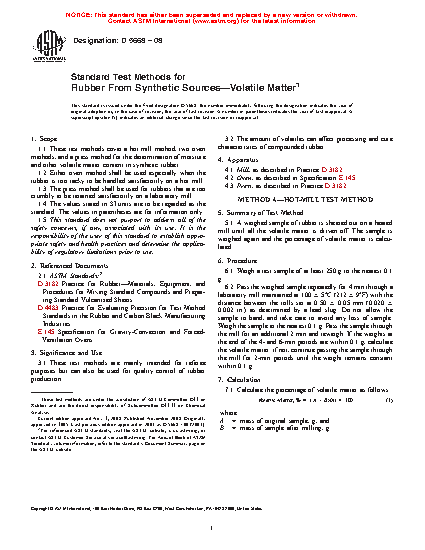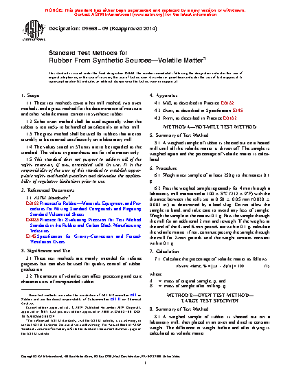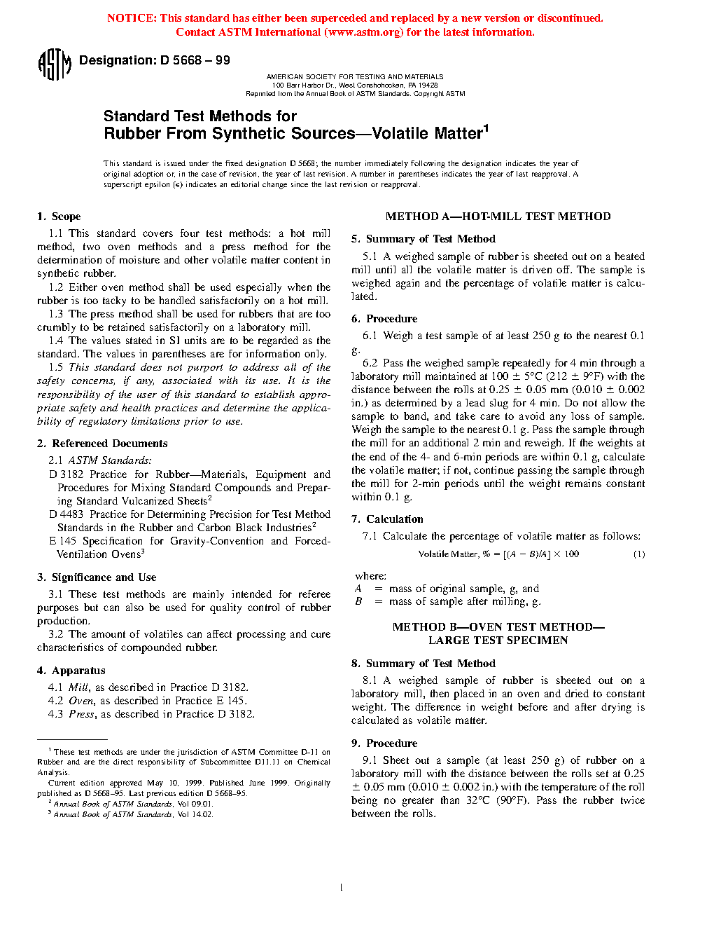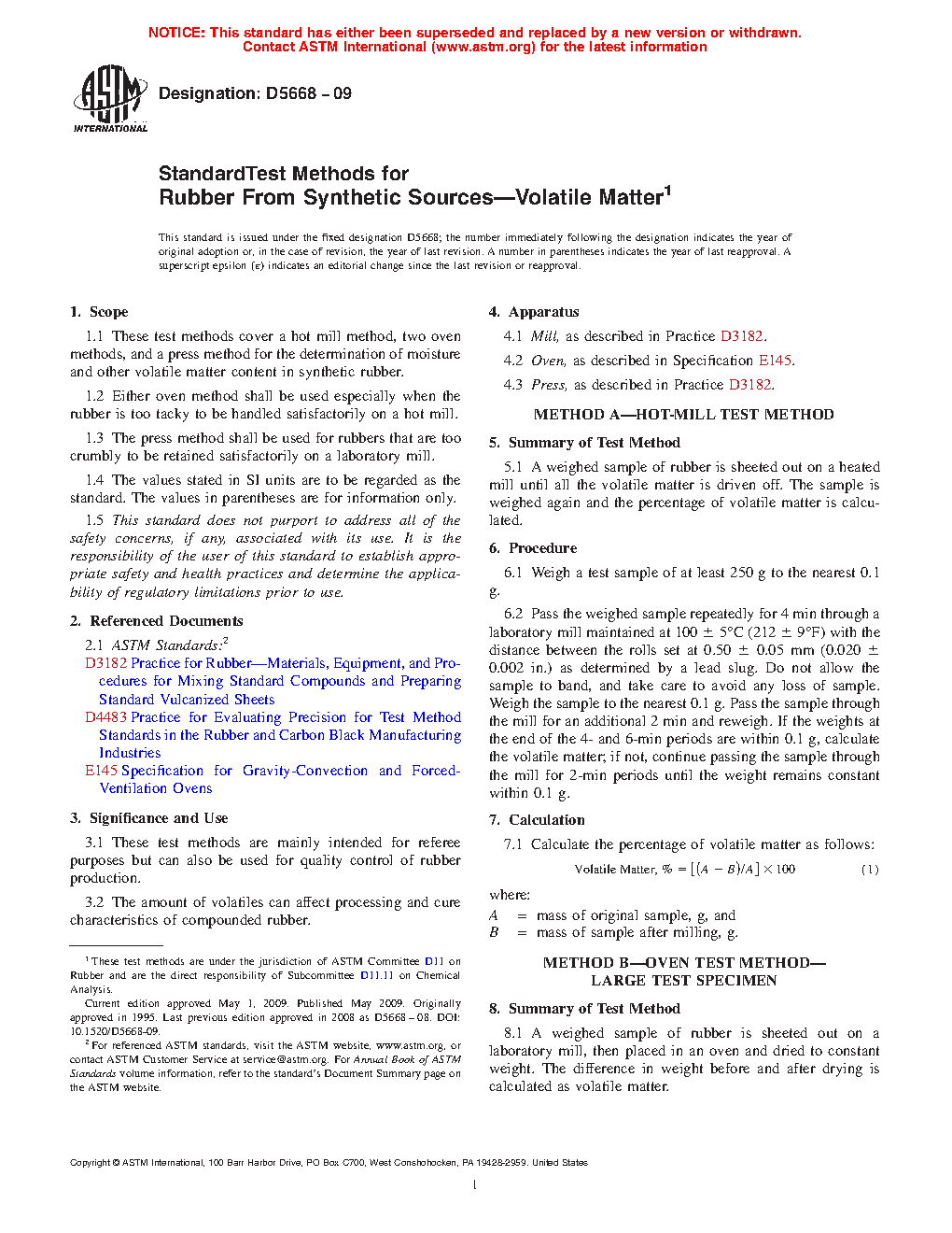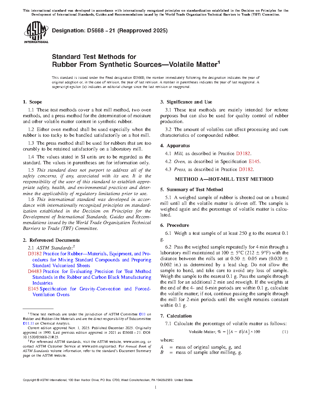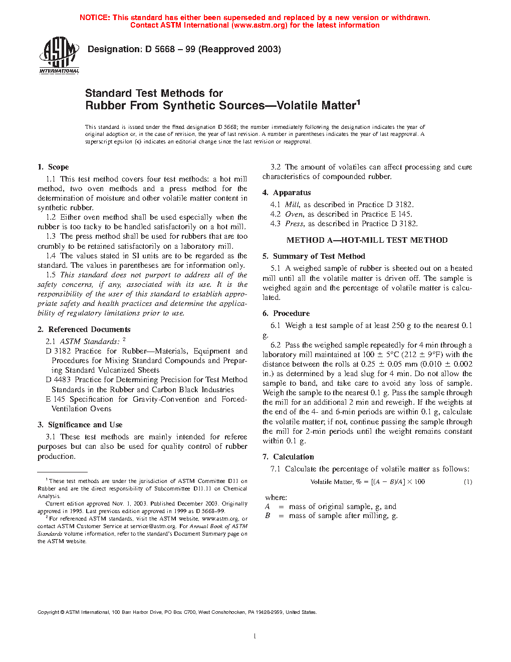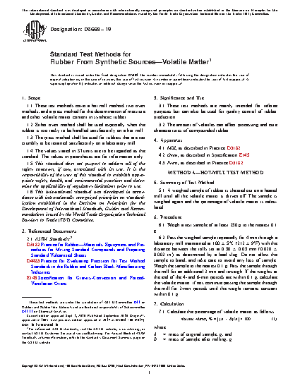 1.1 These test methods cover a hot mill method, two oven methods, and a press method for the determination of moisture and other volatile matter content in synthetic rubber.