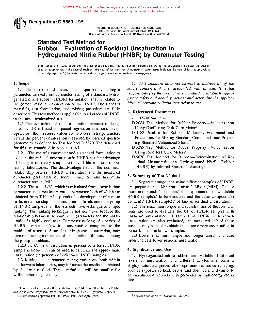 1.1 This test method covers a technique for evaluating a parameter, derived from curemeter testing of a standard hydrogenated nitrile rubber (HNBR) formulation, that is related to the percent residual unsaturation of the HNBR. The standard materials, test formulation, and mixing procedure are fully described. This test method is applicable to all grades of HNBR in the raw unvulcanized state.