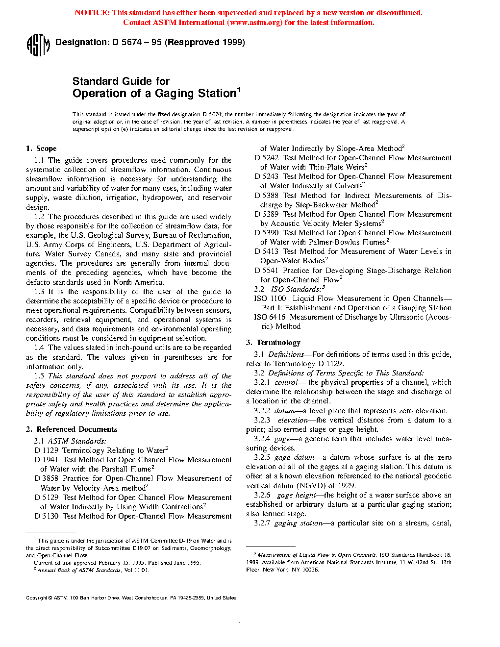 1.2 The procedures described in this guide are used widely by those responsible for the collection of streamflow data, for example, the U.S. Geological Survey, Bureau of Reclamation, U.S. Army Corps of Engineers, U.S. Department of Agriculture, Water Survey Canada, and many state and provincial agencies. The procedures are generally from internal documents of the preceding agencies, which have become the defacto standards used in North America.