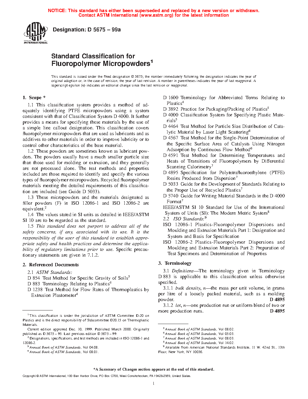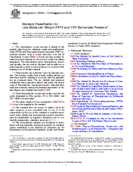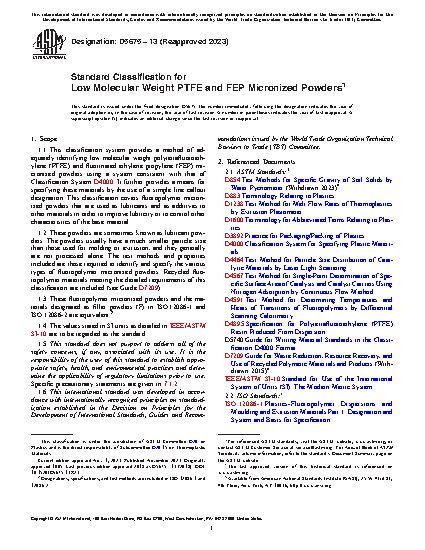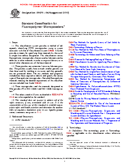 1.2 These powders are sometimes known as lubricant powders. The powders usually have a much smaller particle size than those used for molding or extrusion, and they generally are not processed alone. The test methods and properties included are those required to identify and specify the various types of fluoropolymer micronized powders. Recycled fluoropolymer materials meeting the detailed requirements of this classification are included (see Guide D7209).