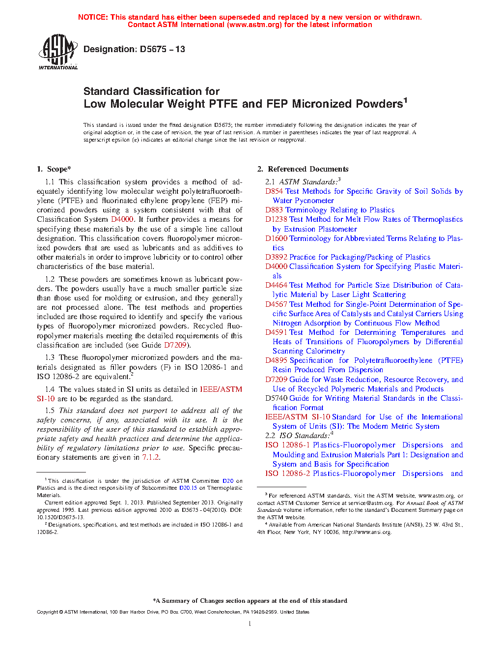 1.1 This classification system provides a method of adequately identifying low molecular weight polytetrafluoroethylene (PTFE) and fluorinated ethylene propylene (FEP) micronized powders using a system consistent with that of Classification System D4000. It further provides a means for specifying these materials by the use of a simple line callout designation. This classification covers fluoropolymer micronized powders that are used as lubricants and as additives to other materials in order to improve lubricity or to control other characteristics of the base material.